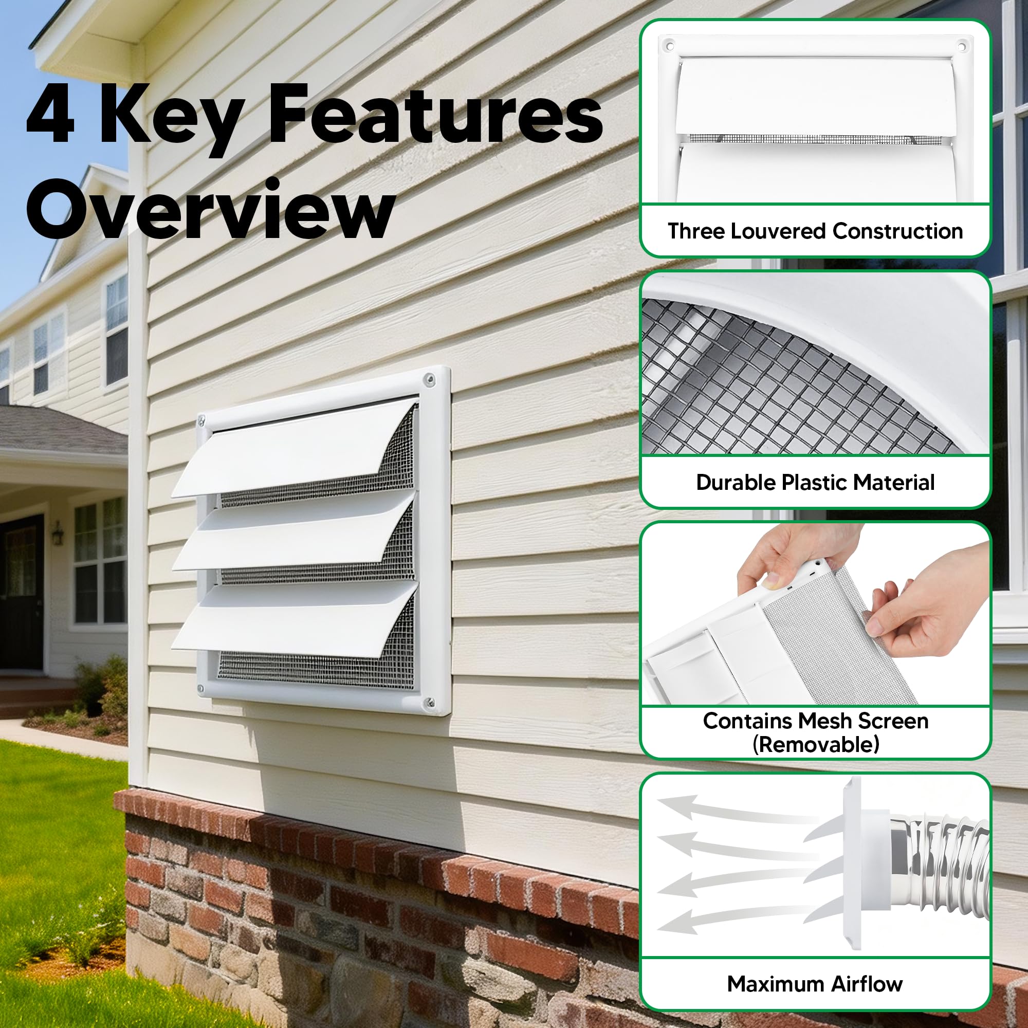 EASY INSTALLATION: Easy to install louvered vent cap for dryer and bath fan venting
