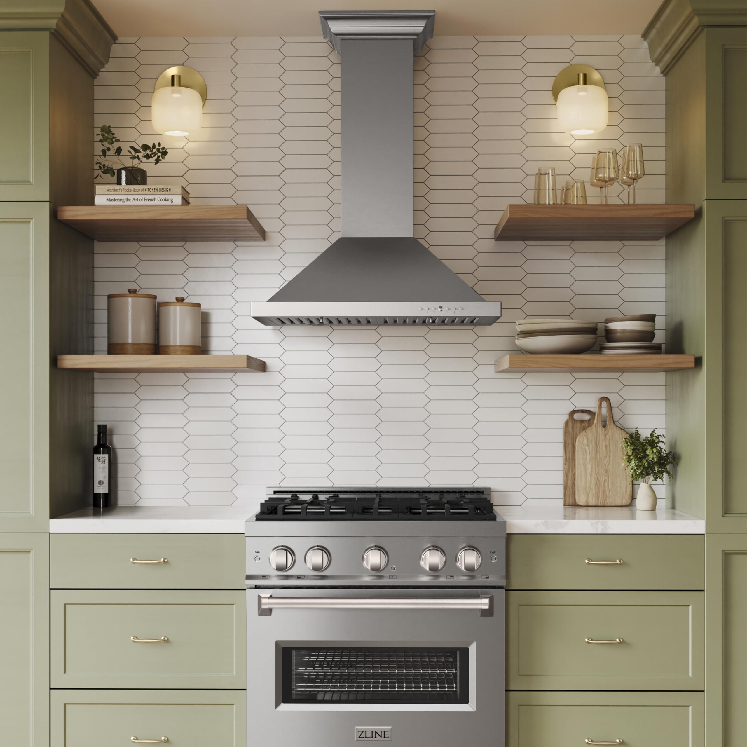 ZLINE 30 in. Wall Mounted Range Hood in Stainless Steel with Crown Molding. This wall mounted range hood is one of the best-selling of the 30 in. models. This beautifully hood with elegantly designed crown molding comes enhanced with a completely installed blower and fan, dishwasher-safe stainless steel baffle filters and a 4-speed push button control panel with an LCD display. Up to 760 CFM ventilation quietly, yet efficiently moves large volumes of air away from your cook-stove area. Short kits and extensions are available for shorter or taller ceilings (outside the standard 8 ft. to 9 ft. range). Contains everything you need for easy installation and factory-tested assurance of performance along with a 3-year parts gives you the confidence that you will enjoy this range hood for years to come. Includes a free LED light upgrade.