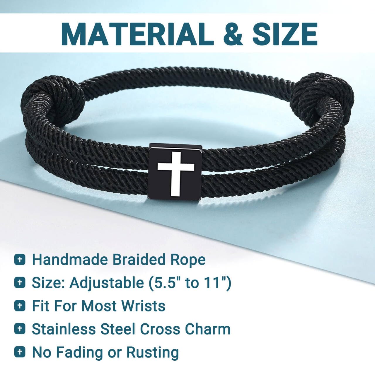 Materials: Our bracelets are made of handmade braided rope, which is strong and sturdy. Comfortable to wear and not easy to break. High quality stainless steel cross charms, never fade or rust.