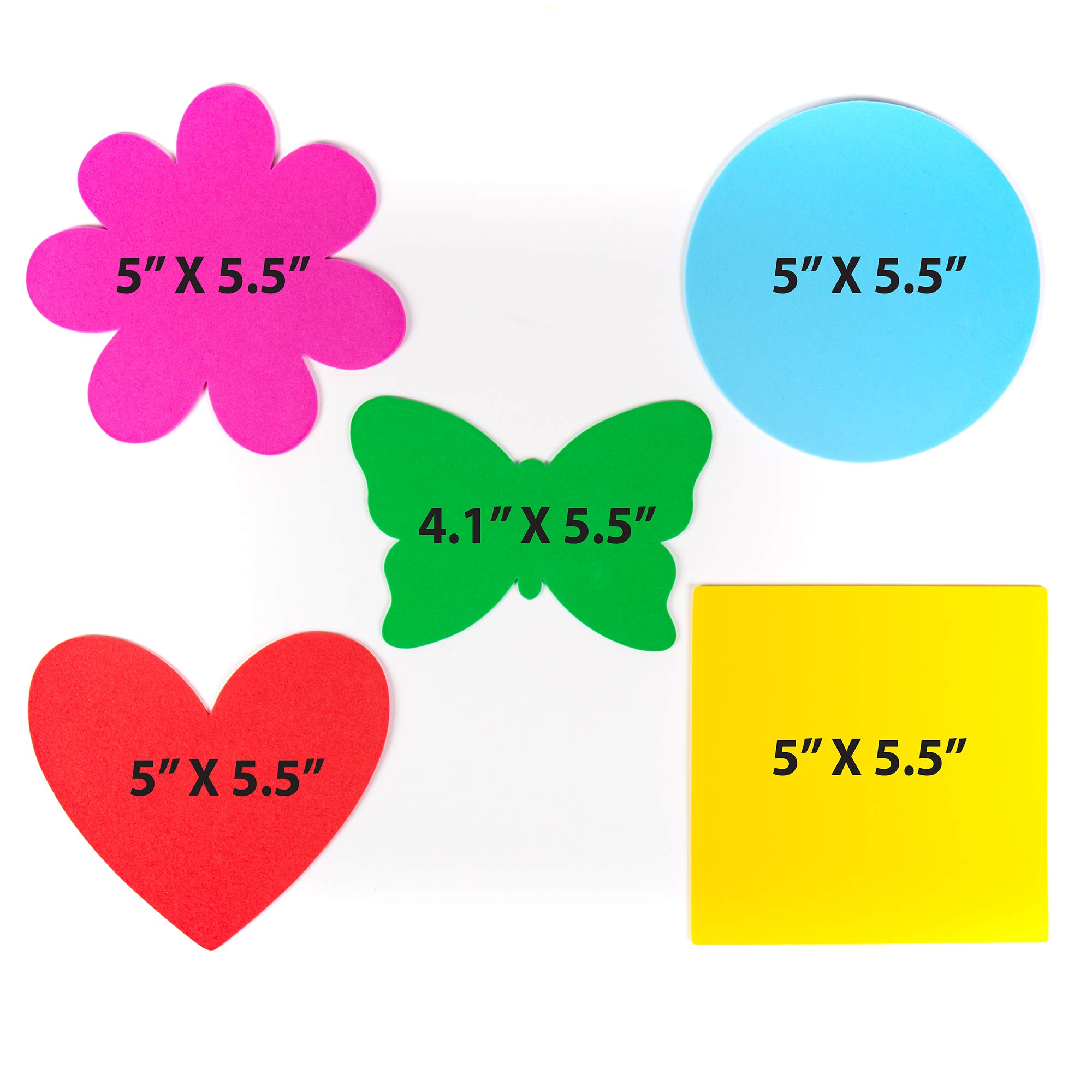 PACK INCLUDES: 10 Foam Butterfly Shapes (4.1 in. x 5.5 in.), 10 Foam Square Shapes (5.5 in. x 5.5 in.), 10 Foam Flower Shapes (5.5 in. x 5.5 in.), 10 Foam Circle Shapes (5.5 in. x 5.5 in.), 10 Foam Heart Shapes (5 in. x 5.5 in.)