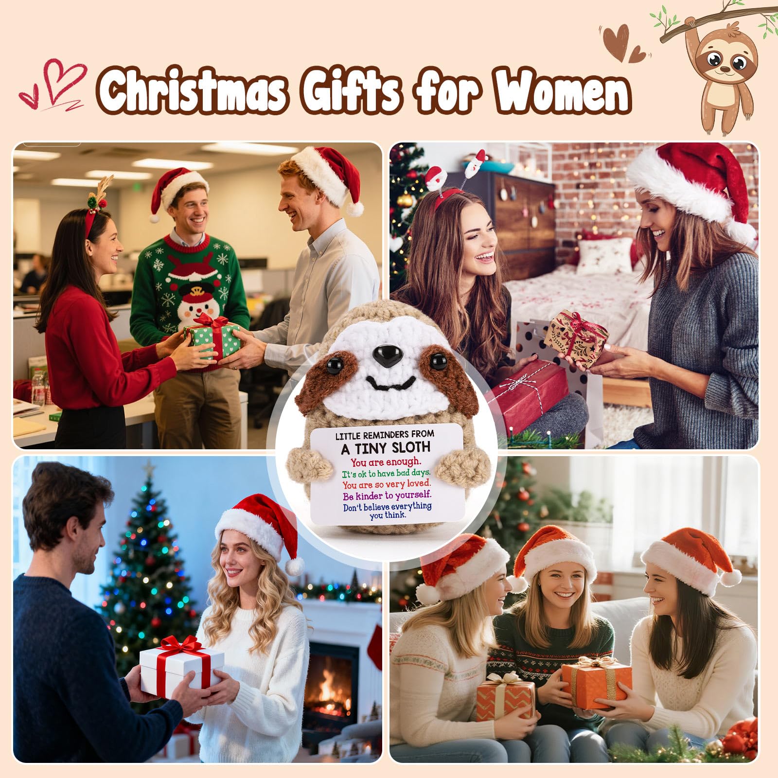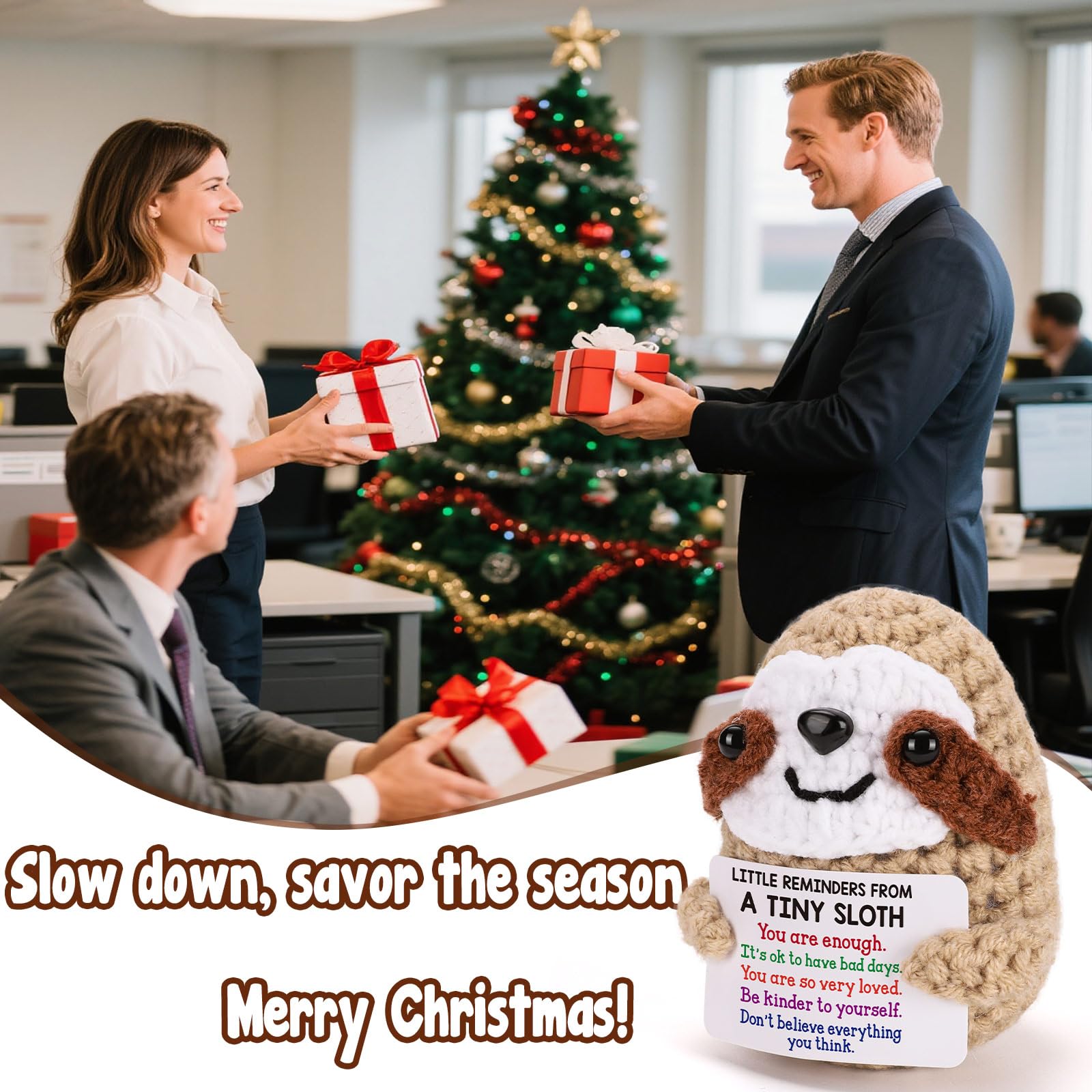 Funny Positive Christmas Sloth: This adorable crochet sloth isn’t just a festive decoration - it’s a warm reminder that you are enough. A perfect Christmas holiday present for women, students, and anyone who could use a little encouragement and holiday cheer.