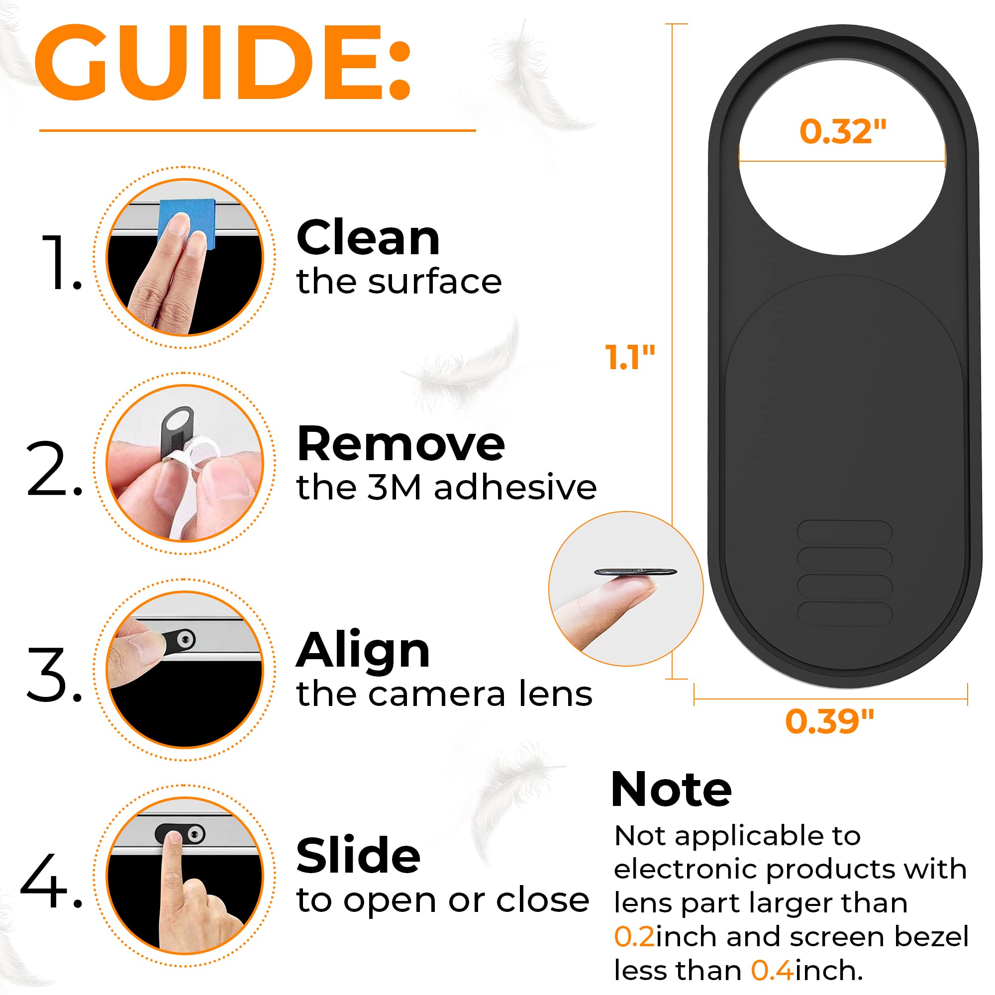 [EASY TO INSTALL]: Applying the camera cover is incredibly simple. Within 5 seconds you are able to apply the webcam cover to your device.