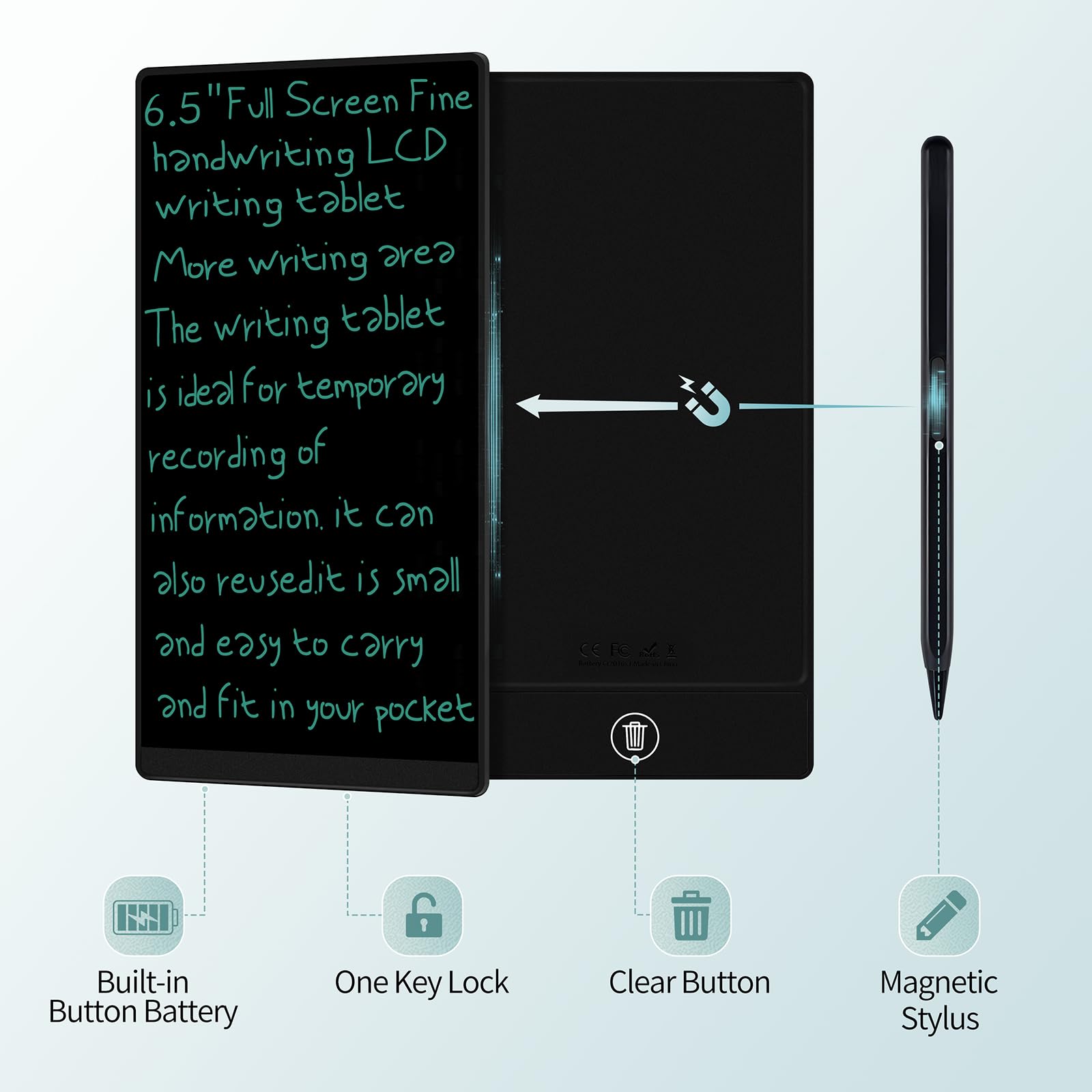 High-quality LCD Writing Tablet: The 6.5-inch writing tablet is made of premium ABS material, more durable; The writing screen is 93.5% of the screen. More comfortable to record, communicate, study or work; Measuring just 0.2 inches thin and weighing only 0.11 LB, it can effortlessly fit into school bags, handbags or travel bags