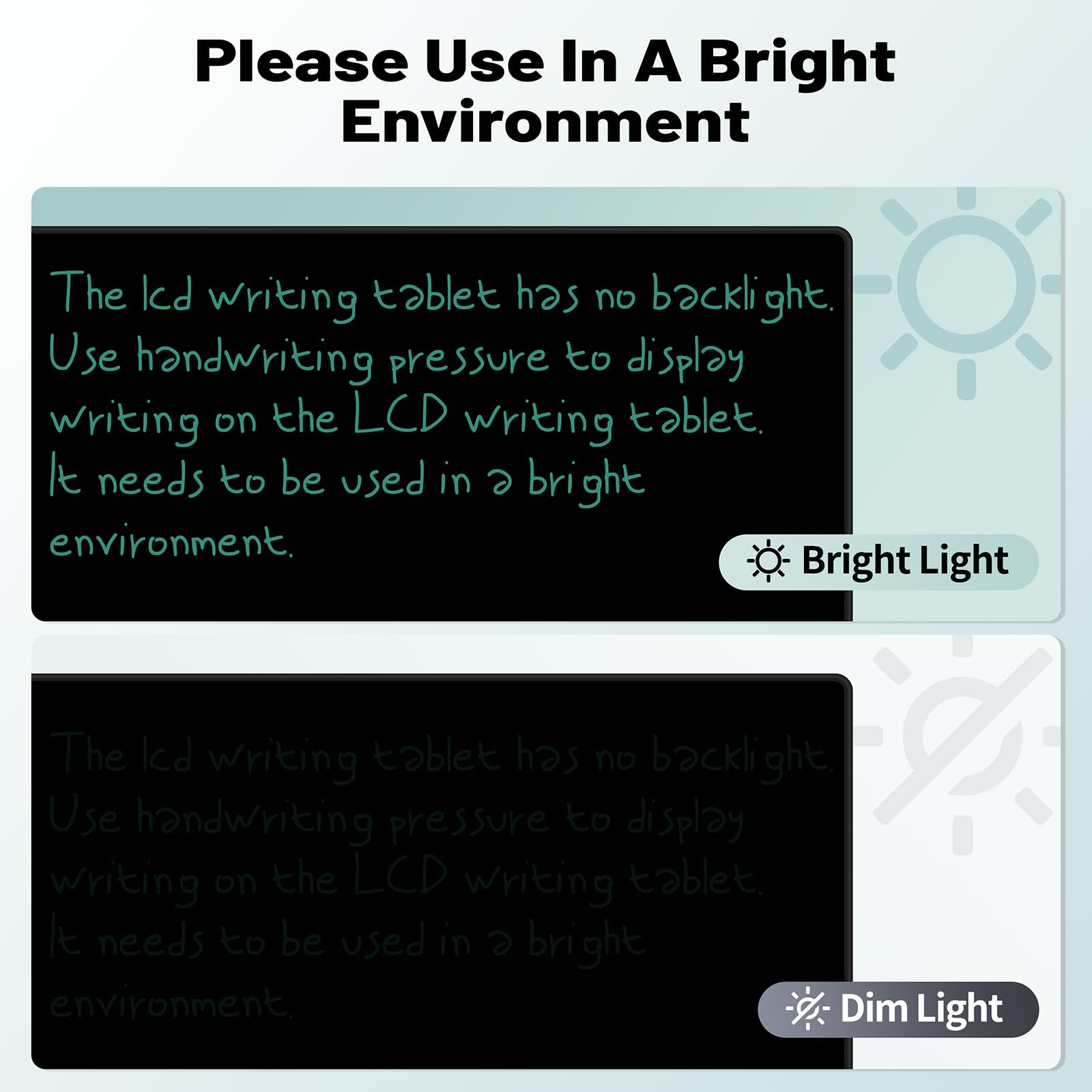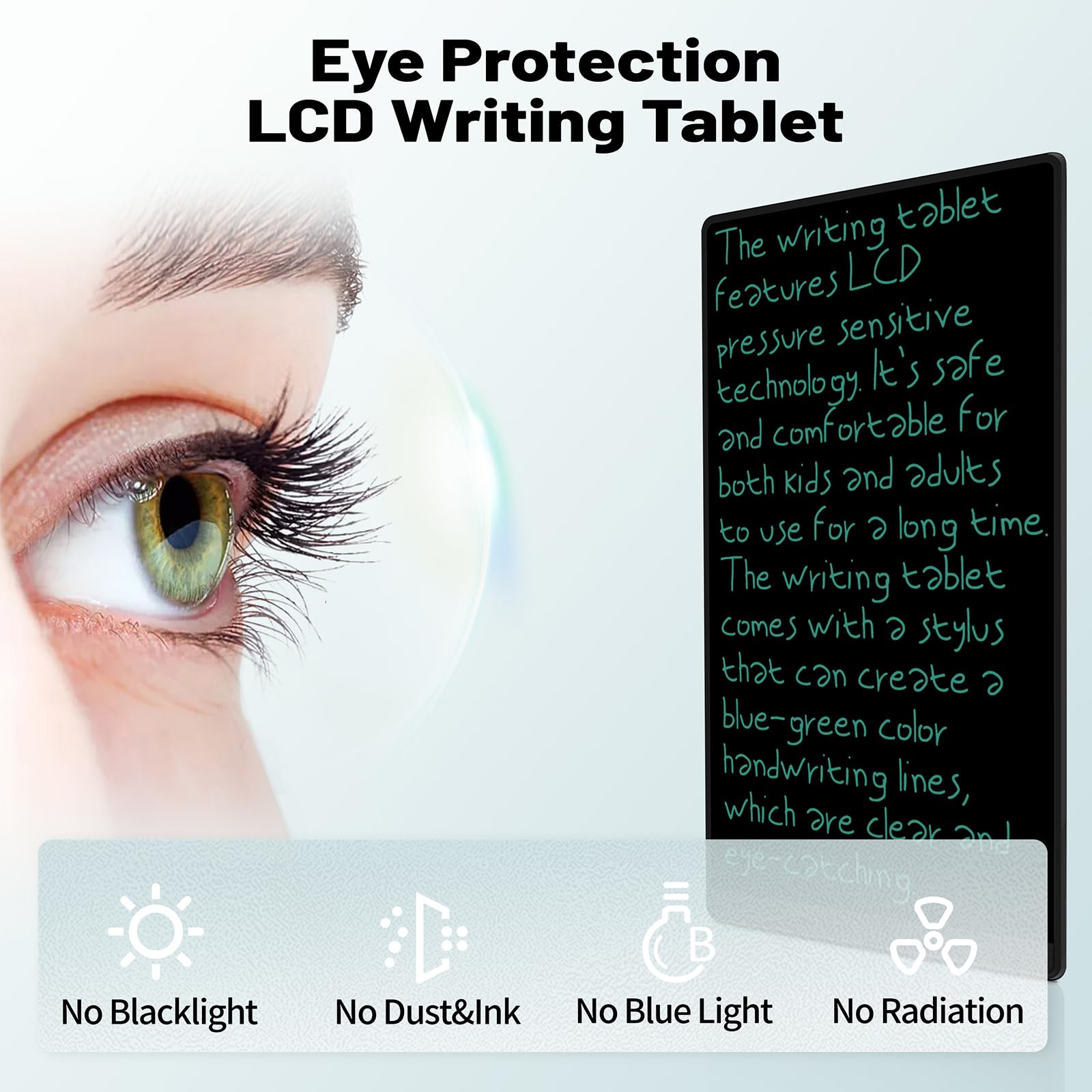 Eye Protection: The LCD writing tablet features pressure sensitive technology, no blue light and no radiation; It's safe and comfortable for both kids and adults to use for a long time; The handwriting pen can create a blue-green color handwriting lines, which are clear and eye-catching; Unlike others, there's no fingerprints or press mark left on the screen, giving you a better writing experience