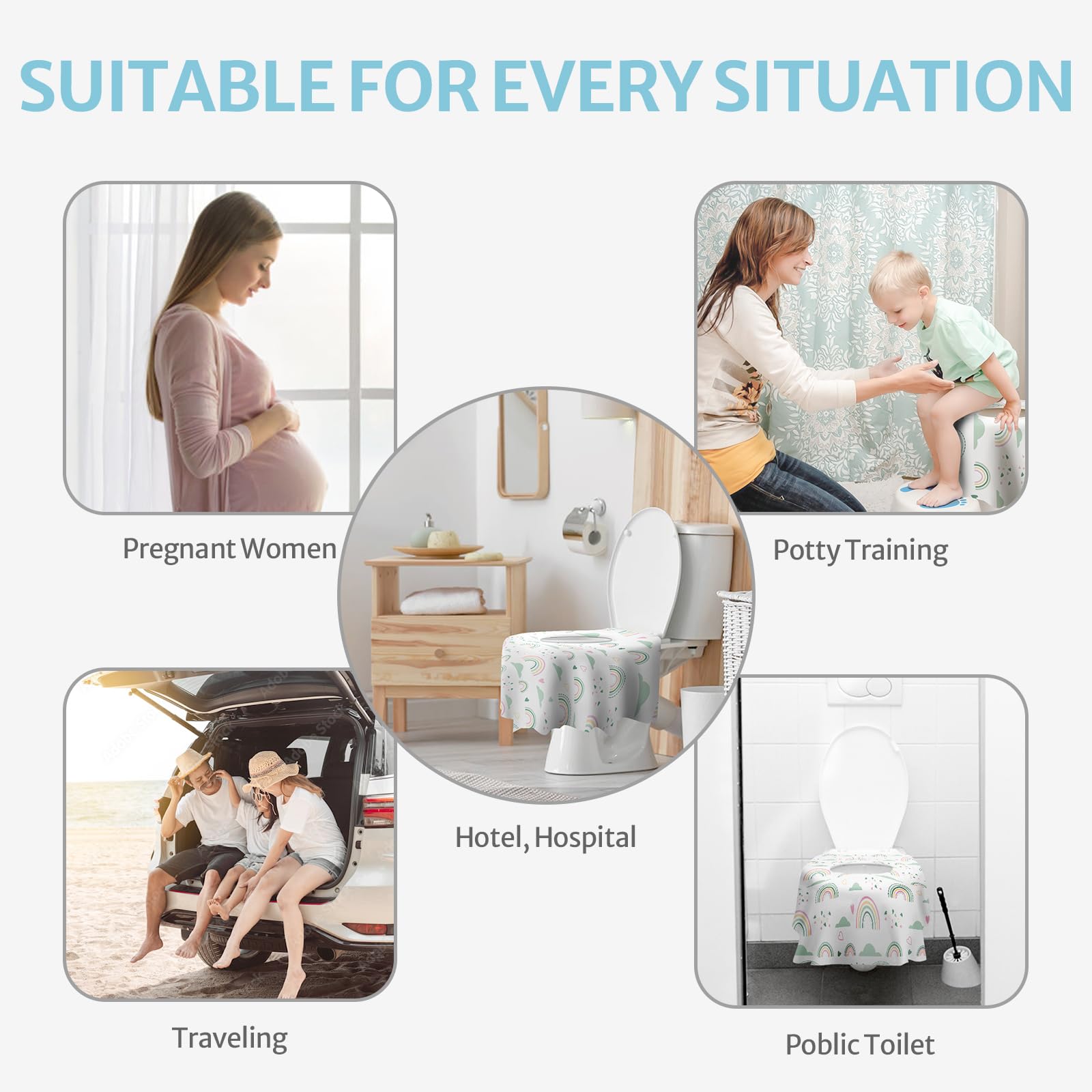 Non-Slip Design: The disposable toilet seat covers for toddlers come with 2 stickers on the back that stick well to the toilet ring, preventing them from falling in or slipping off. Ideal for training children to use the toilet independently