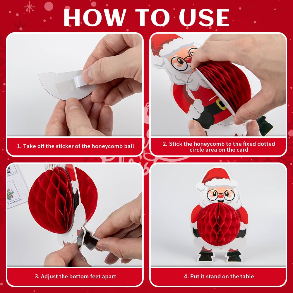 🥳HOW TO USE: Christmas centerpieces for tables are used in two different ways. Tear off the sticker of the honeycomb ball, stick the suitable size honeycomb to the fixed dotted circle area on the card and stand with feet apart, put it stand on the Christmas table centerpieces. Take out two same size christmas tree cards, insert them cross into the notches