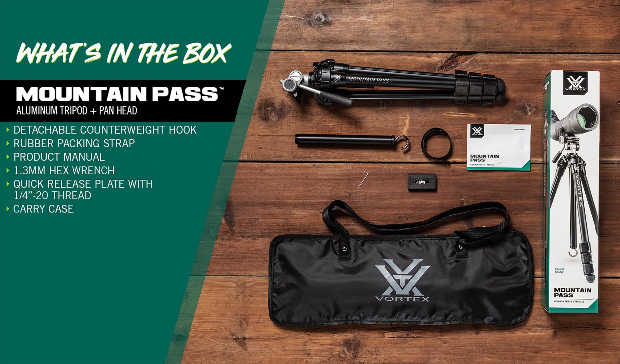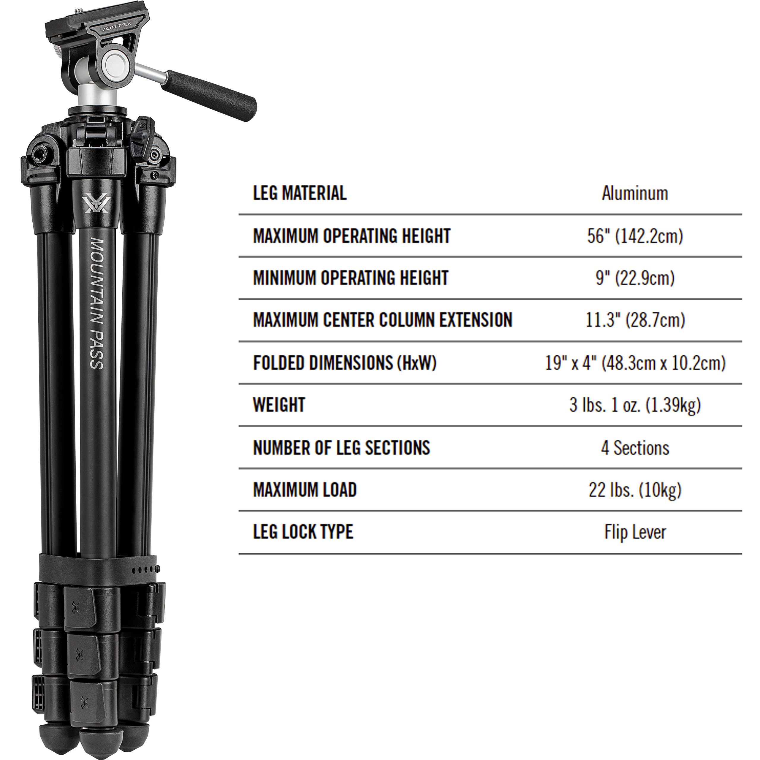 The machined aluminum design offers outstanding durability in a smaller light weight package and with a 22-pound max load; the Mountain Pass wonβt struggle under the weight of larger binoculars and spotting scopes.