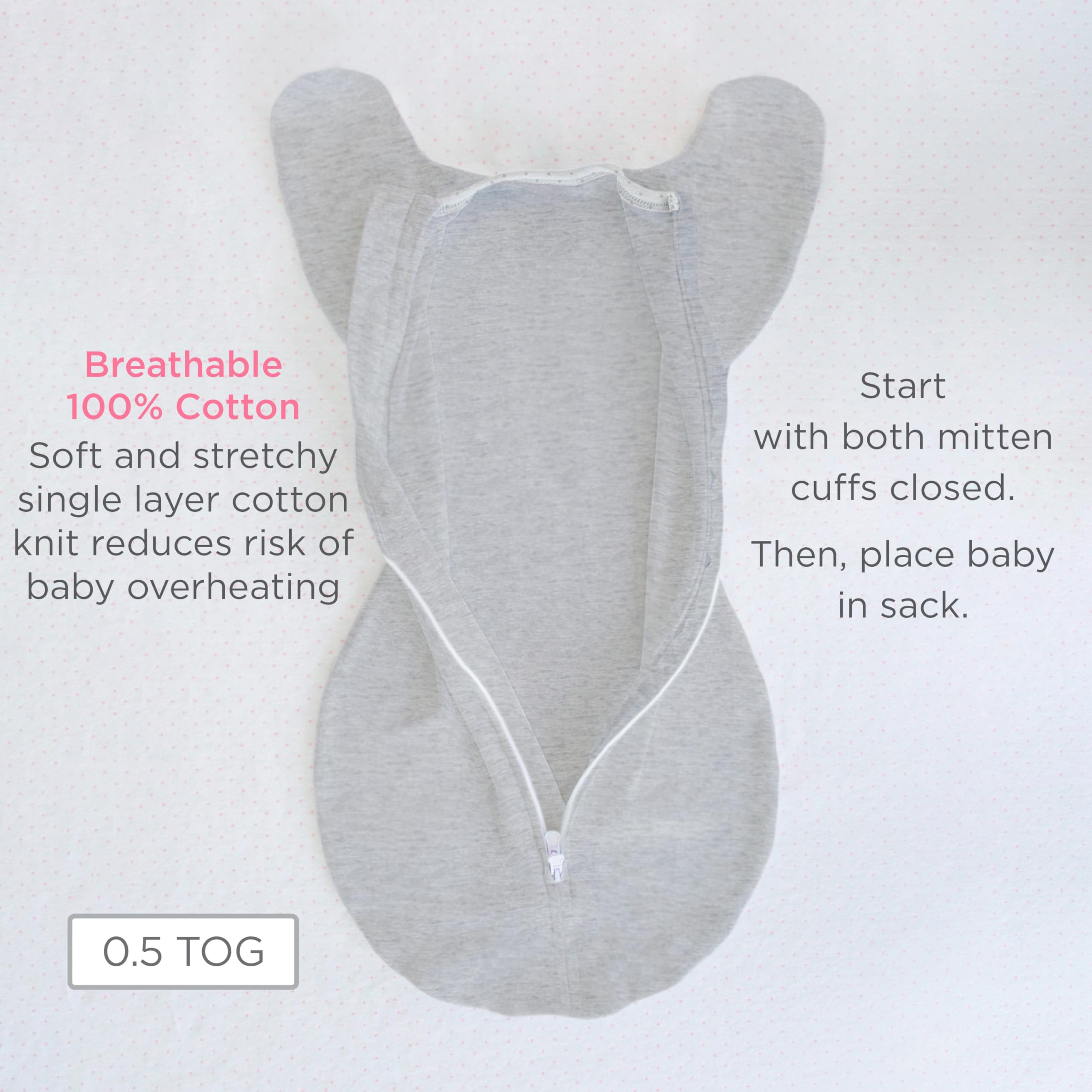 The Transitional Swaddle Sack is the easiest & safest way to transition baby from a traditional swaddle. The arms up sleeve design allows baby to self-soothe and the unique ½-length sleeves with foldover mitten cuffs closed provide partial suppression of the Startle Reflex to promote better sleep; and, if baby rolls over during sleep, the sleeves allow baby to use arms to lift torso and head to access air to promote safer sleep. The Transitional Swaddle Sack is ideal for babies who prefer to sleep with arms up, babies who are starting to rollover, and babies who break out of a traditional swaddle. The uniquely-shaped, ½-length sleeves are not full length, so when mitten cuffs are closed, baby’s arms will be flexed close to body for swaddle snugness. The foldover mitten cuffs may be worn open or closed. Caregiver can open one or both cuffs, so baby can self-soothe by sucking directly on hand. Helpful 2-way zipper with 2 zipper pulls. The zipper zips down from the top to make it easy to place baby in the sack and zips up from the bottom to make it easy to change baby’s diaper. Designed by a nurse. 100% Cotton. Soft, stretchy cotton knit. 0.7 TOG. Machine wash warm and tumble dry low. US patents 11,812,795 & D833,613 with patents in EU, UK, CA, CN, JP and other countries.