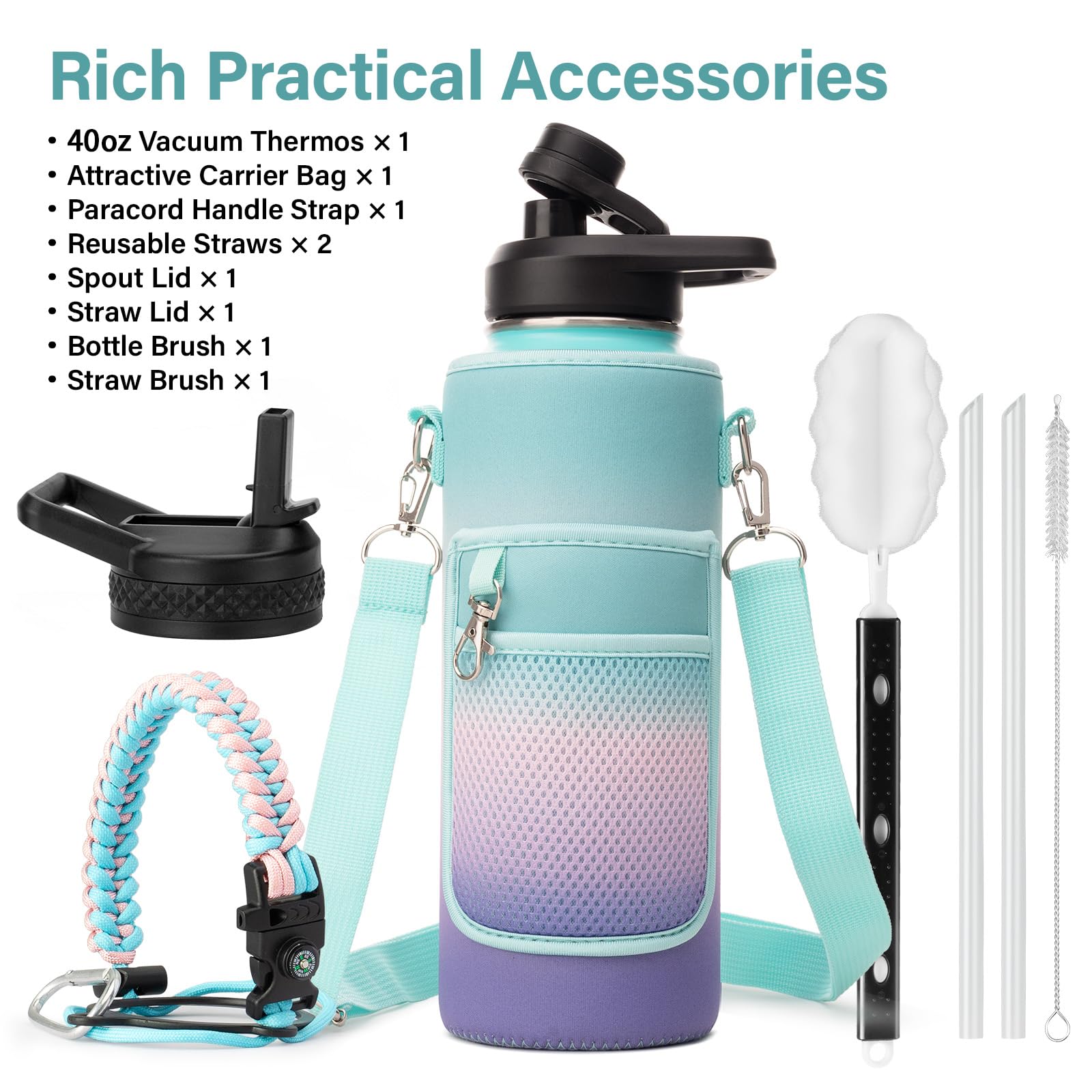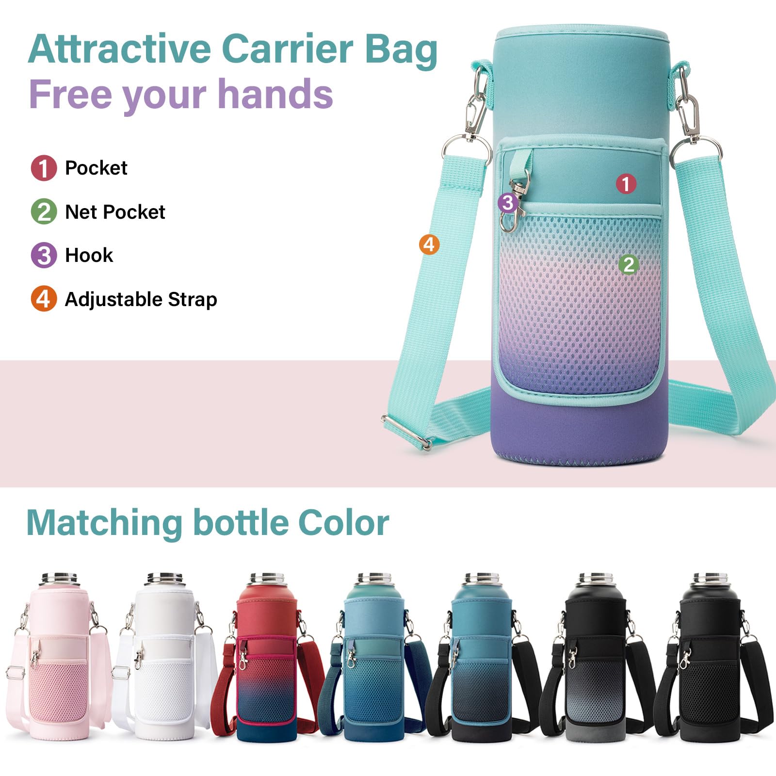 VERSATILE AND STYLISH CARRIER BAG:The colorful water bottle carrier bag is designed to match the bottle's body, adding a touch of flair while providing practical functionality. The shoulder strap and carabiner make it easy to carry and hang, whether you're out on a hike or running errands. Plus, the small storage bag for your phone and a hook for keys make this bottle even more versatile.