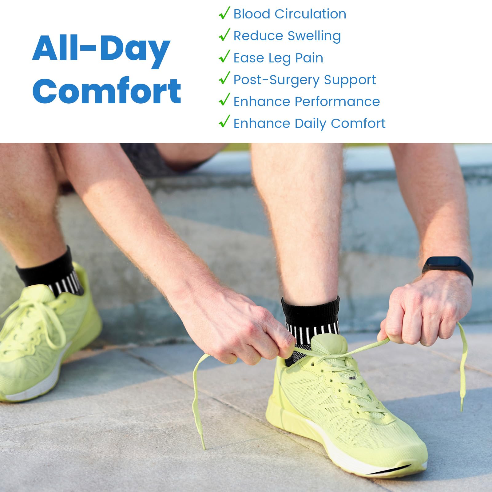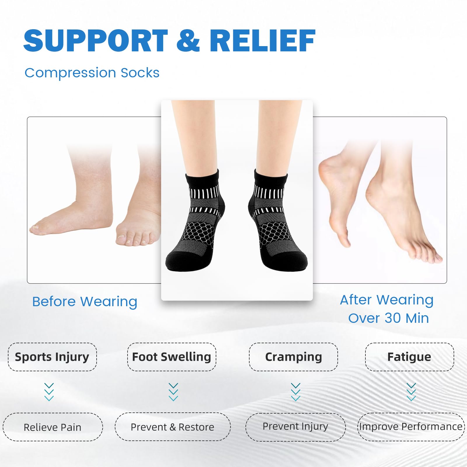 Ankle Compression Support – 360° ankle compression design provides balanced pressure for the ankle and a comfortable daily stable wrapping sensation. A safe and stable fit helps alleviate plantar fasciitis pain, reduce post exercise swelling and muscle fatigue, and improve performance during running, gym or long shifts.