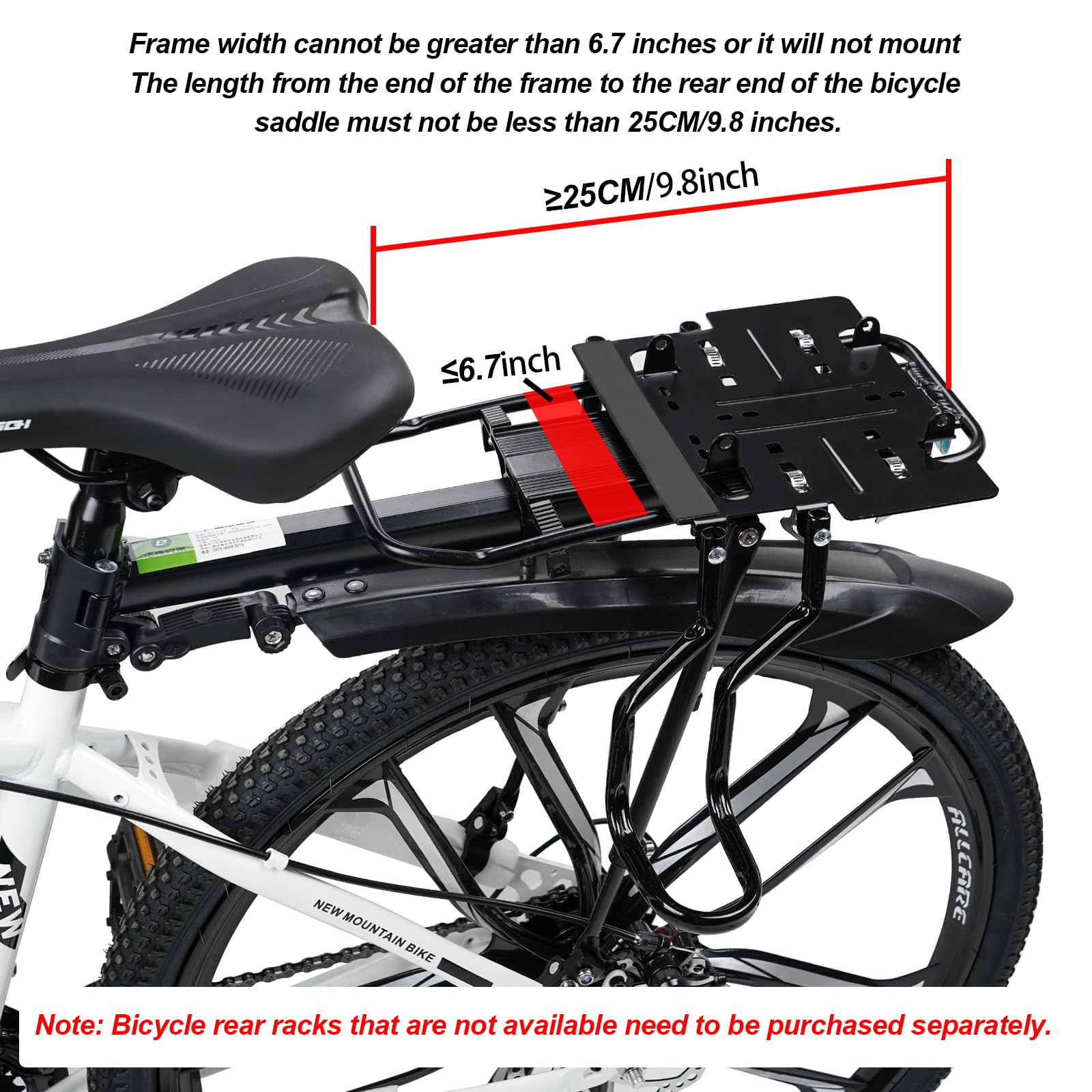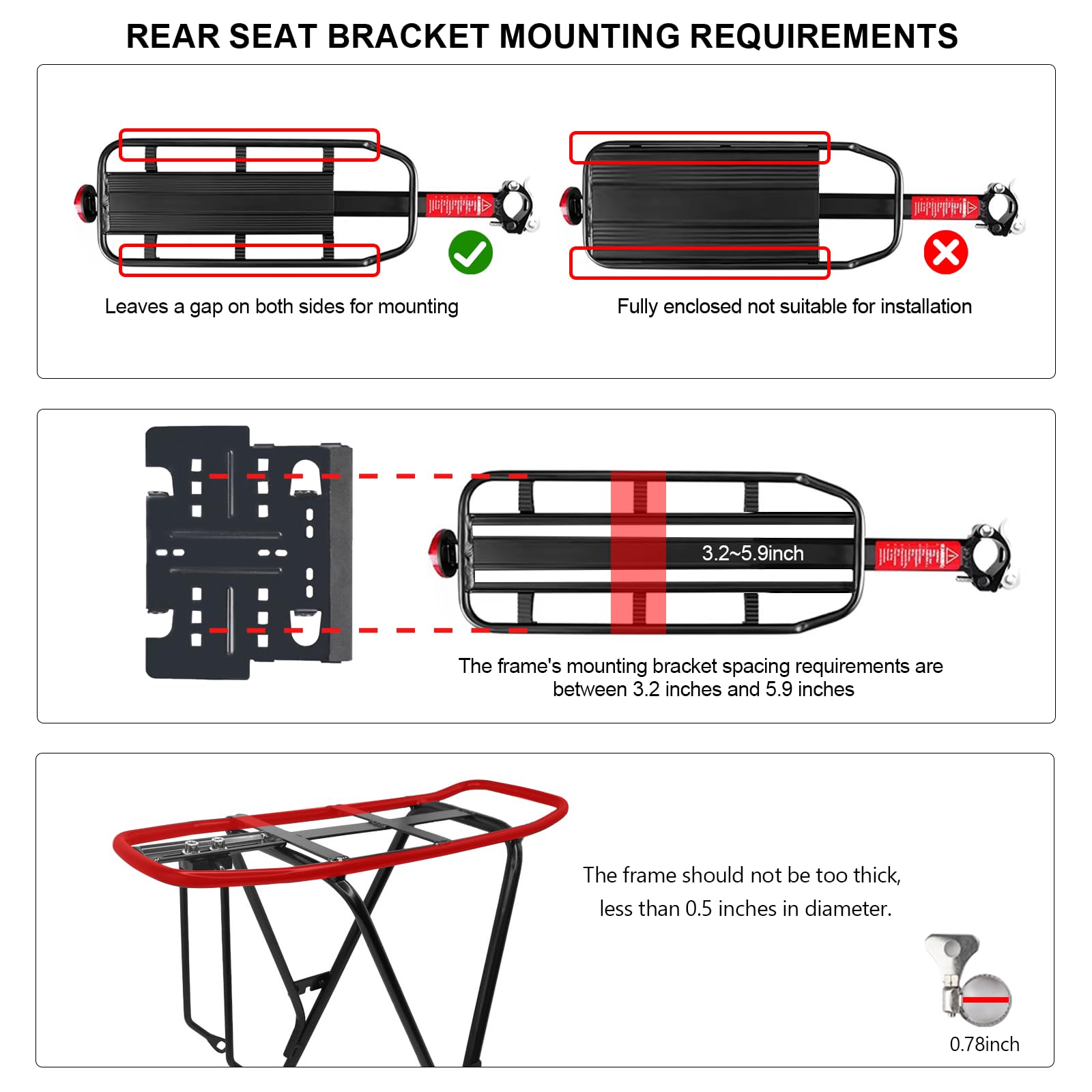 【INSTALLATION REQUIREMENTS】 Only a flat bicycle frame is needed for installation. The length from the end of the bicycle frame to the back of the bicycle seat cushion must be greater than 9.8 inches, and the width of the bicycle frame must be less than 7.2 inches. Please confirm the frame size before purchasing. If you have any questions about the rear seat, please feel free to contact us