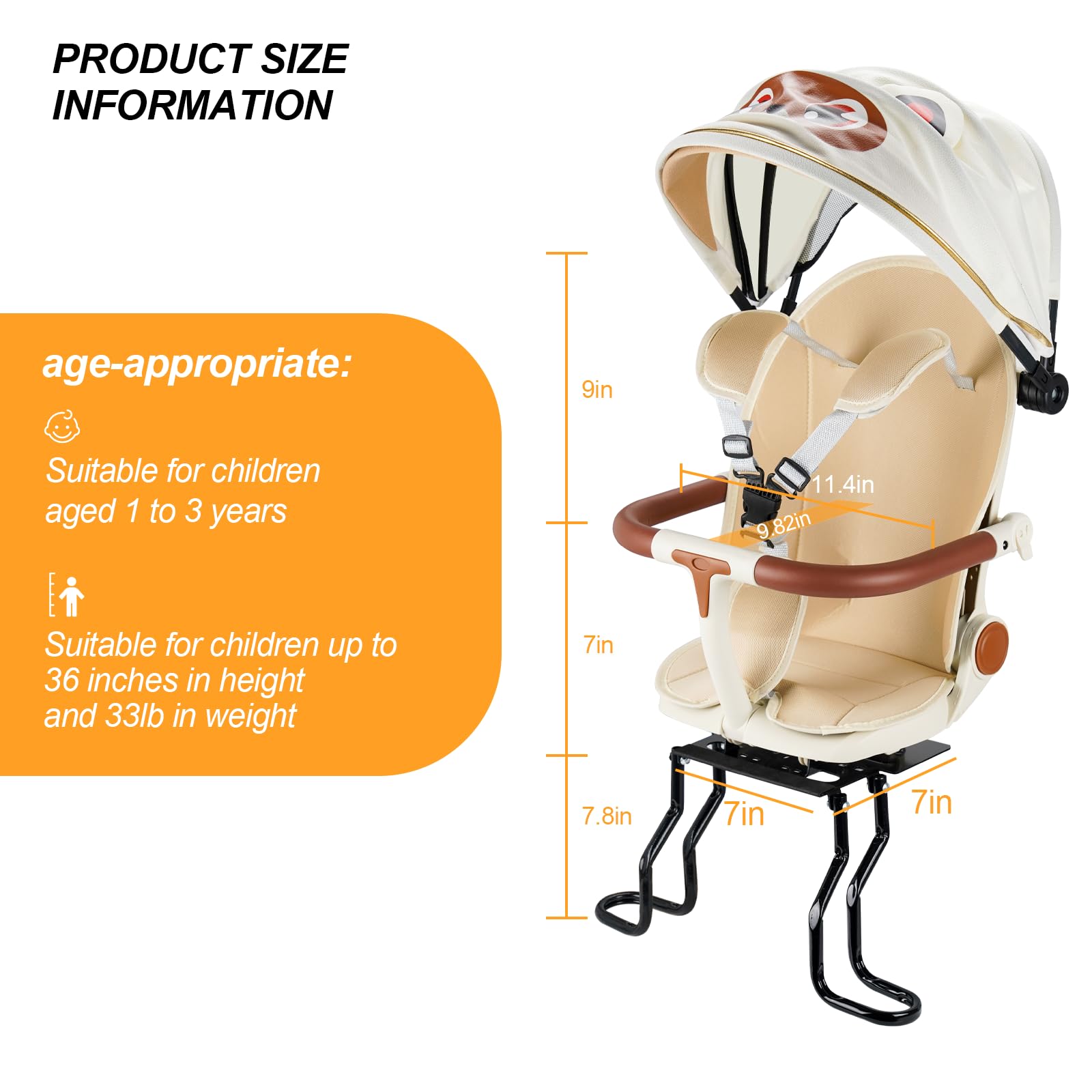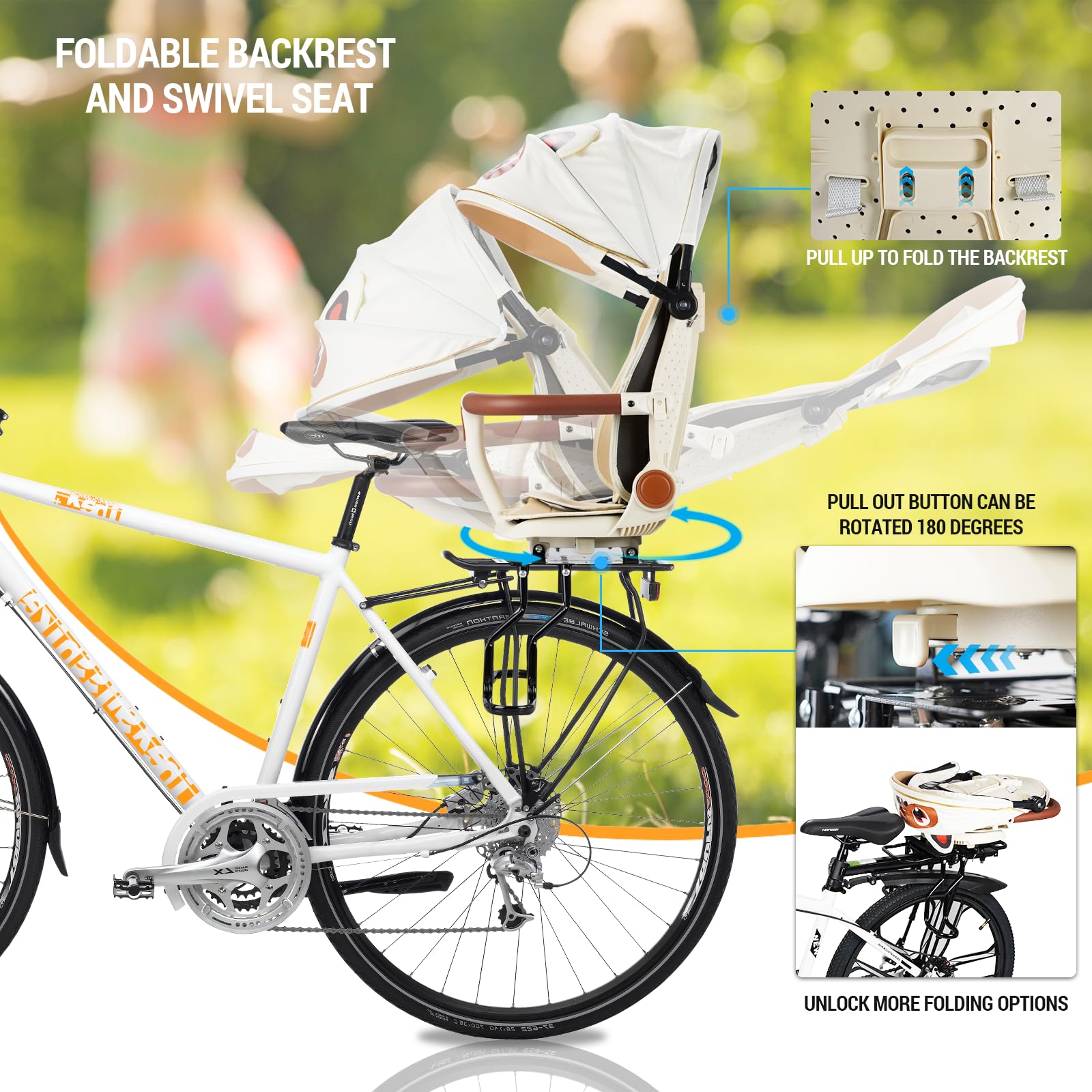 【ADJUSTABLE AND COMFORTABLE】The rear child bike seat has two modes: sitting position and sleeping position; children can ride happily with their parents, and the sitting position allows children to better appreciate the scenery on the road; when children are tired from playing, they can change the seat into a sleeping position to allow children to sleep comfortably;The child bike seat is suitable for children aged 1-3 years old