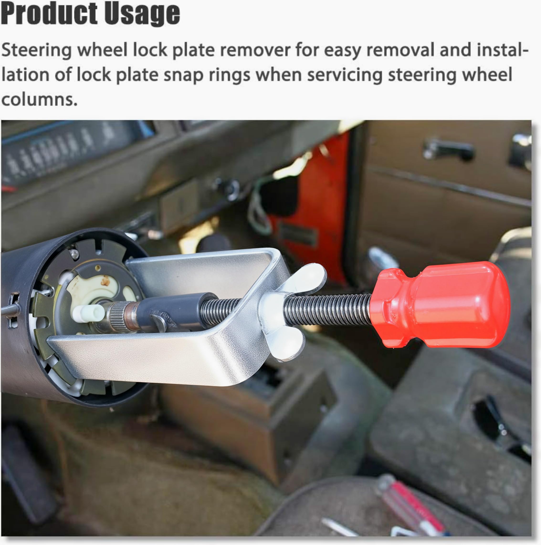 【Function】Steering Wheel Lock Plate Removal Tool. Designed to depress lock plate and remove steering wheel lock plate. Designed for use on air bagged equipped vehicles.