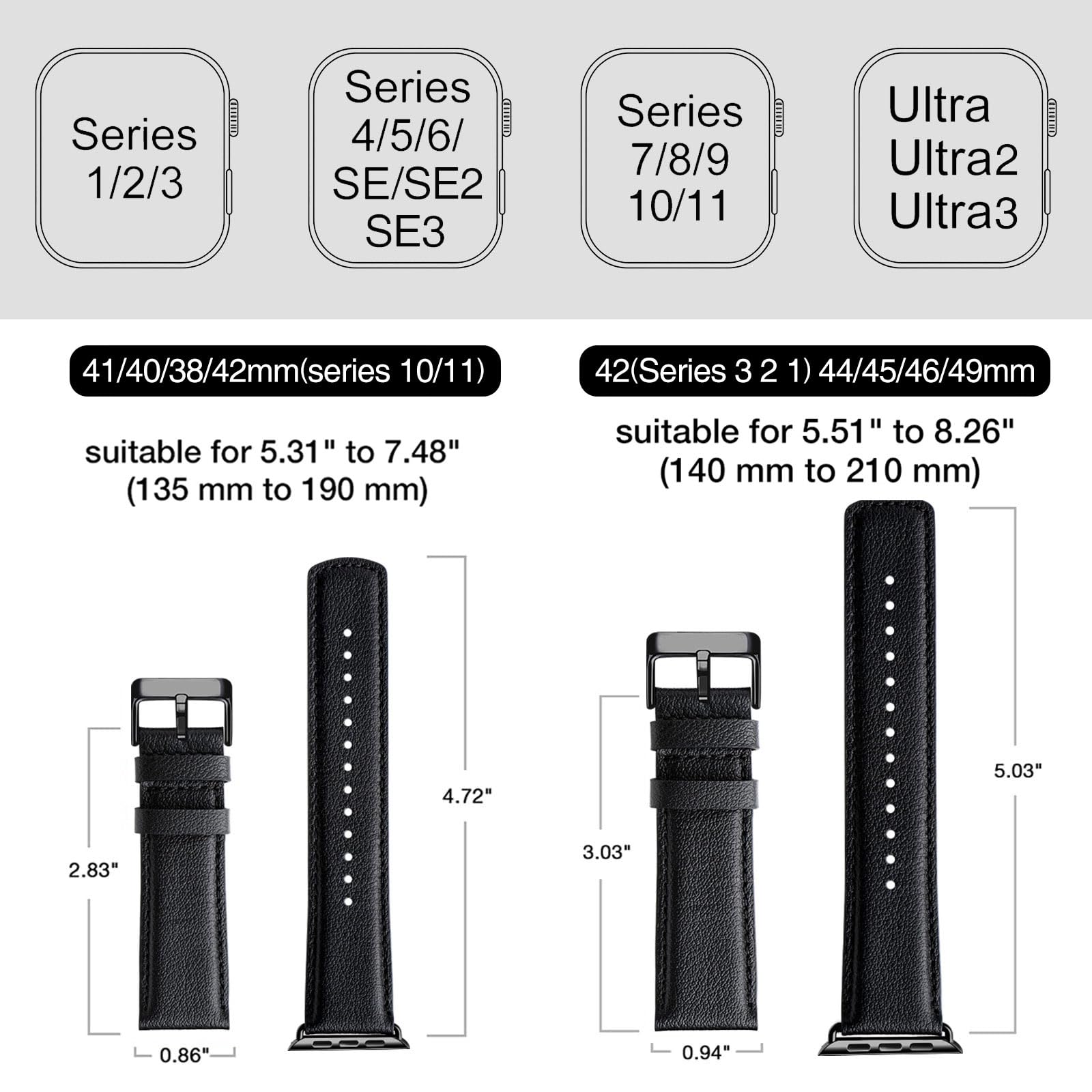 Perfect Compatibility: Our band is designed to fit Apple Watch models 42mm(Series 3 2 1) 44mm 45mm 46mm 49mm and is compatible with Ultra 3, Ultra 2, Ultra, SE3,SE2, SE, Series 11 10 9 8 7 6 5 4 3 2 1. The wrist strap is suitable for wrists from 5.51" to 8.26" (140 mm to 210 mm), ensuring a perfect fit for both small and large wrists