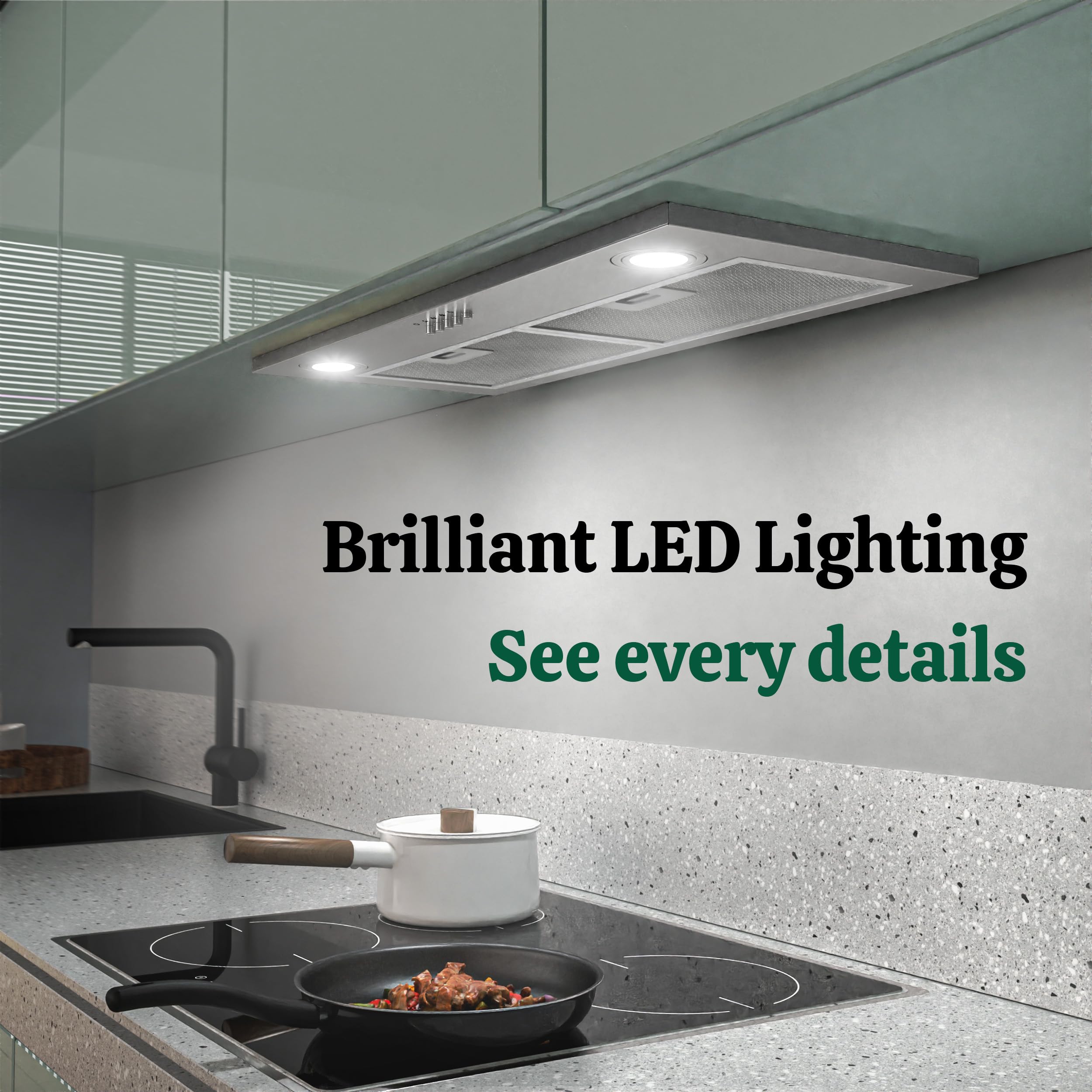 BRIGHT LED LIGHTING: Dual front-facing LED lights illuminate your cooking surface, whether you're working on the left or right side of the stove. This kitchen hood brings both style and function to your space