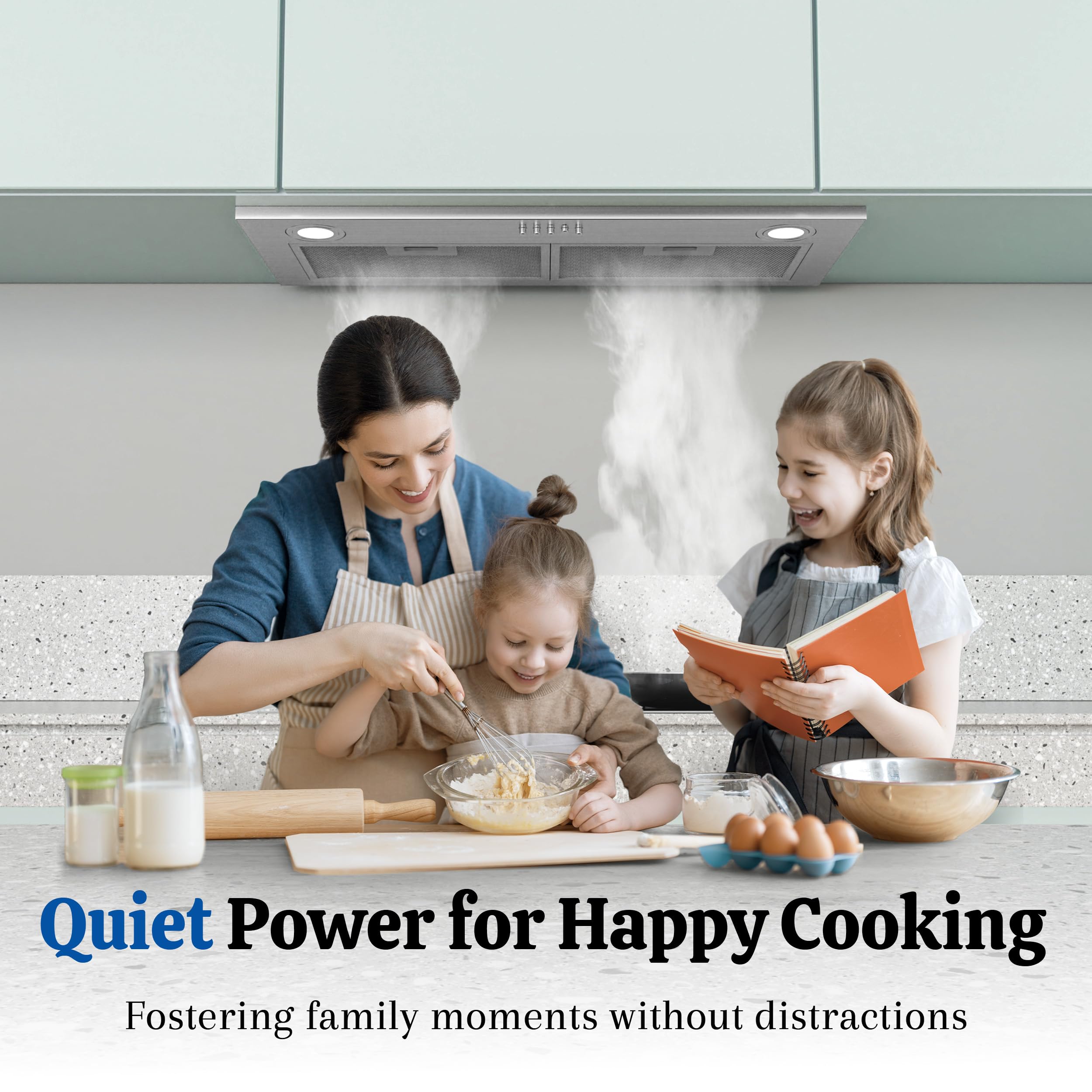POWERFUL RANGE HOOD: This 30 inch range hood insert delivers strong suction at 600 CFM to effectively remove smoke, grease, and odors from your kitchen. Despite its power, the stove vent hood operates at a quiet max noise level of only 56dB—comparable to a casual conversation