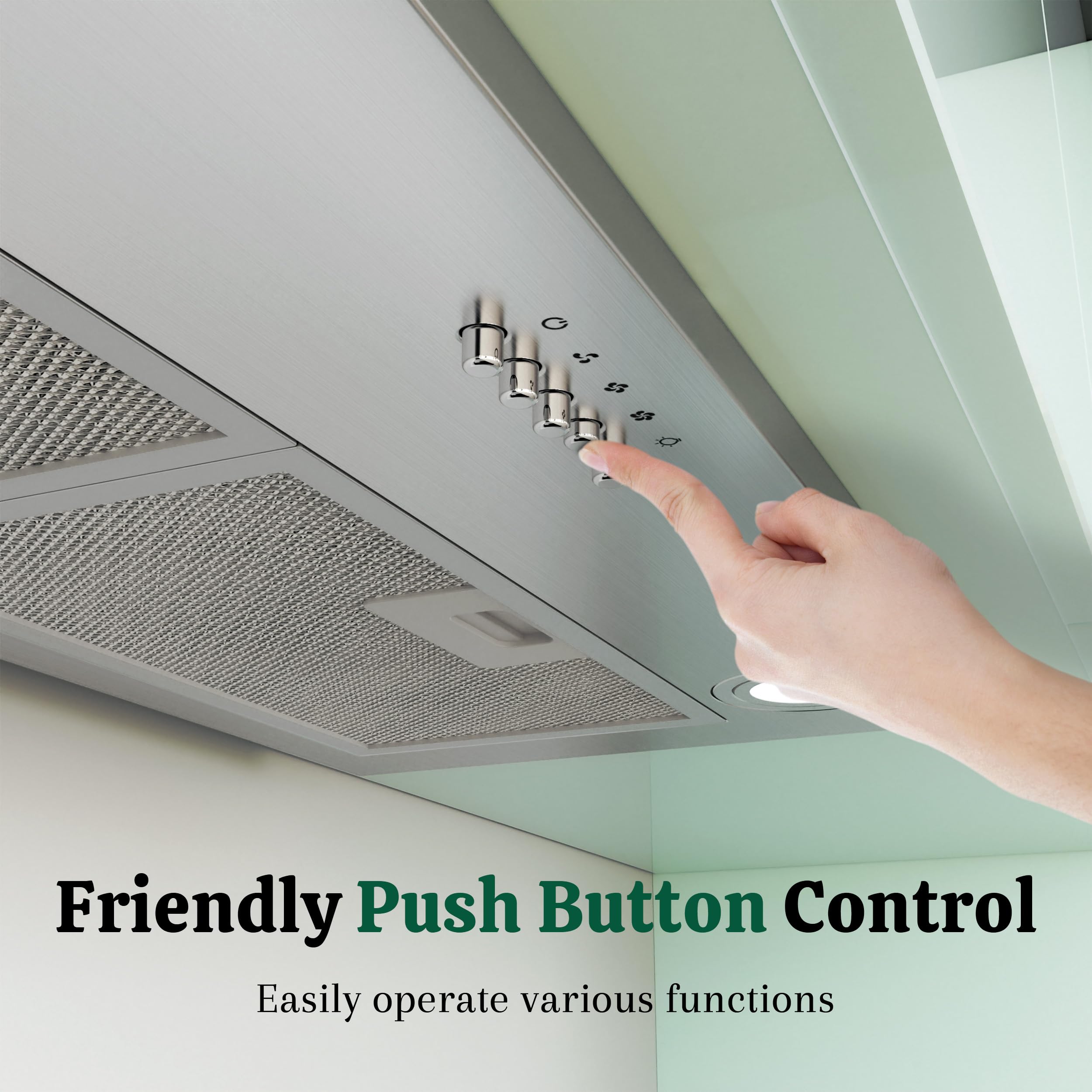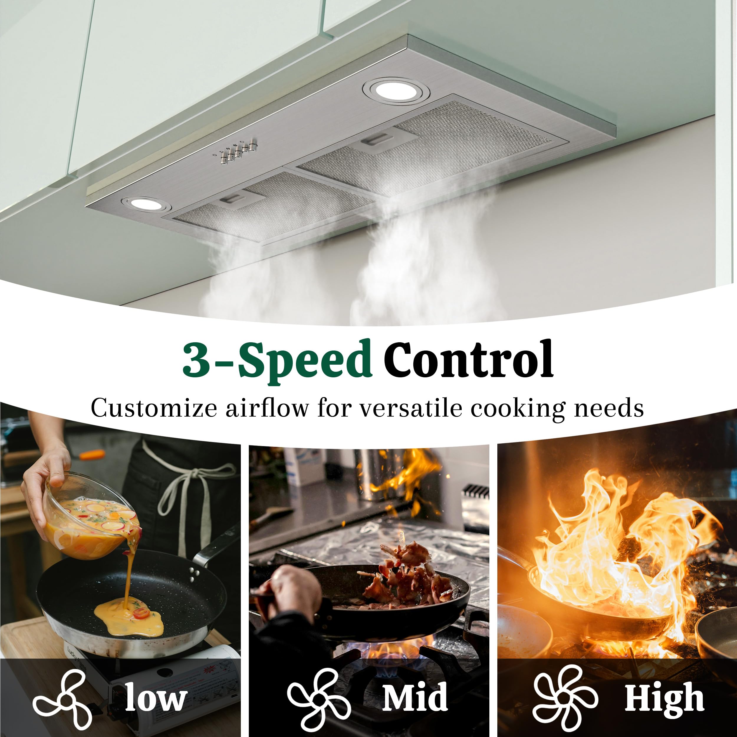 EASY 3-SPEED BUTTON CONTROL: This hood vent features a user-friendly mechanical control panel with 3 fan speeds, allowing you to adjust suction power based on your cooking needs. The push buttons work reliably even under high heat or with wet hands, ensuring consistent performance every time