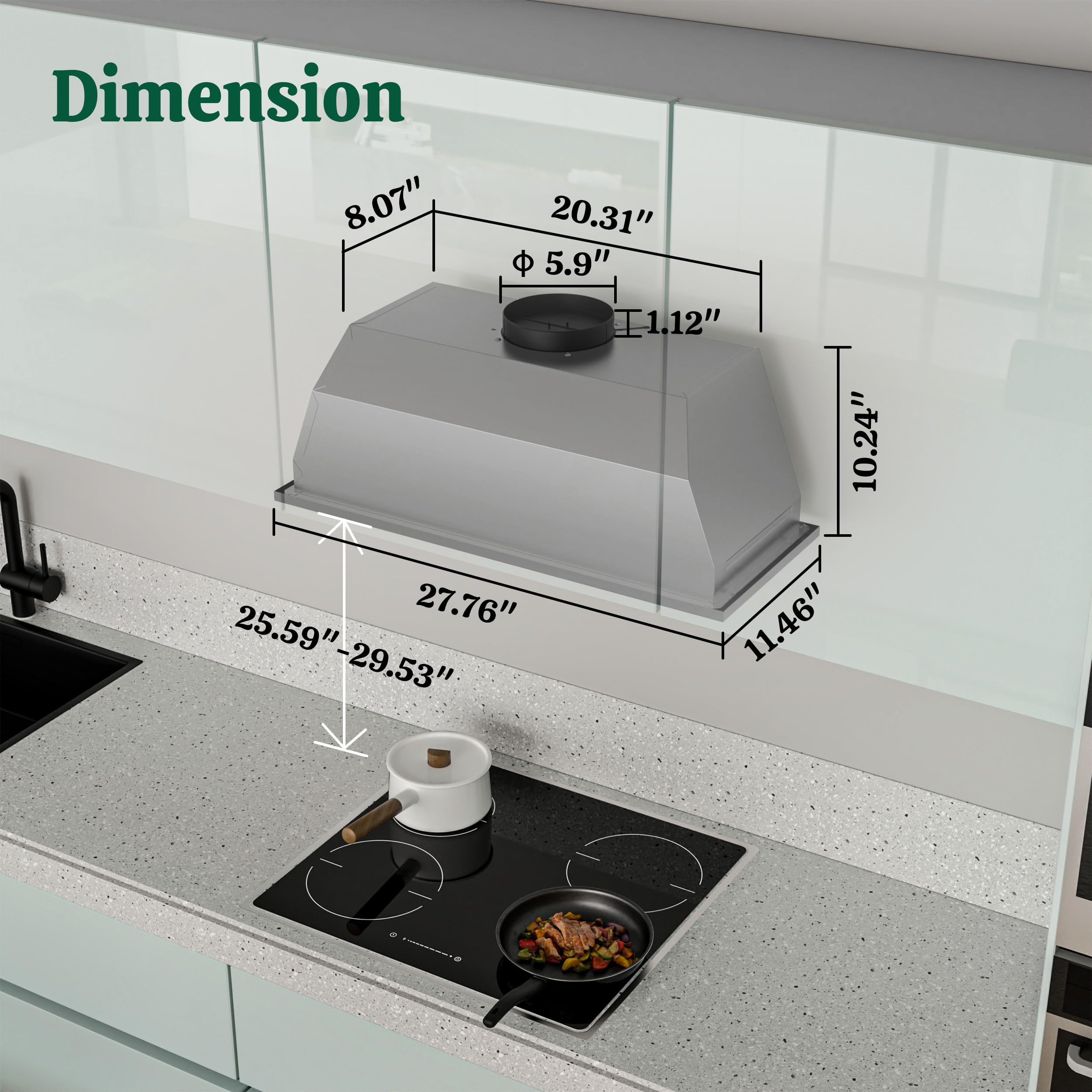 BUILT-IN DESIGN & SIZE: Perfect for custom cabinetry, this insert range hood fits neatly into your kitchen. Product Size: 27.8”(W) x 11.5”(D) x 10.3”(H); Recommended Cutout Size: 26”(W) x 10.2”(D); 5.9” round top vent. FIREGAS range hoods come with a 1-year warranty. Contact us if you have any questions