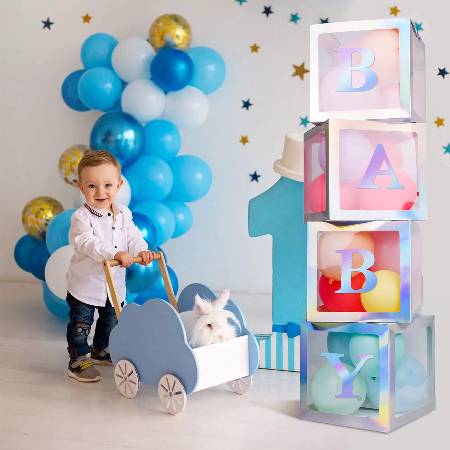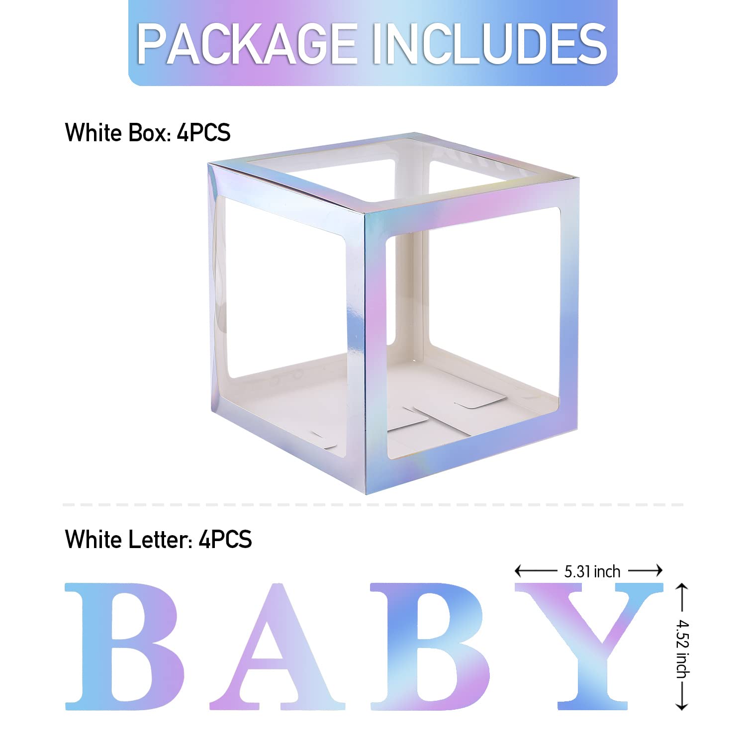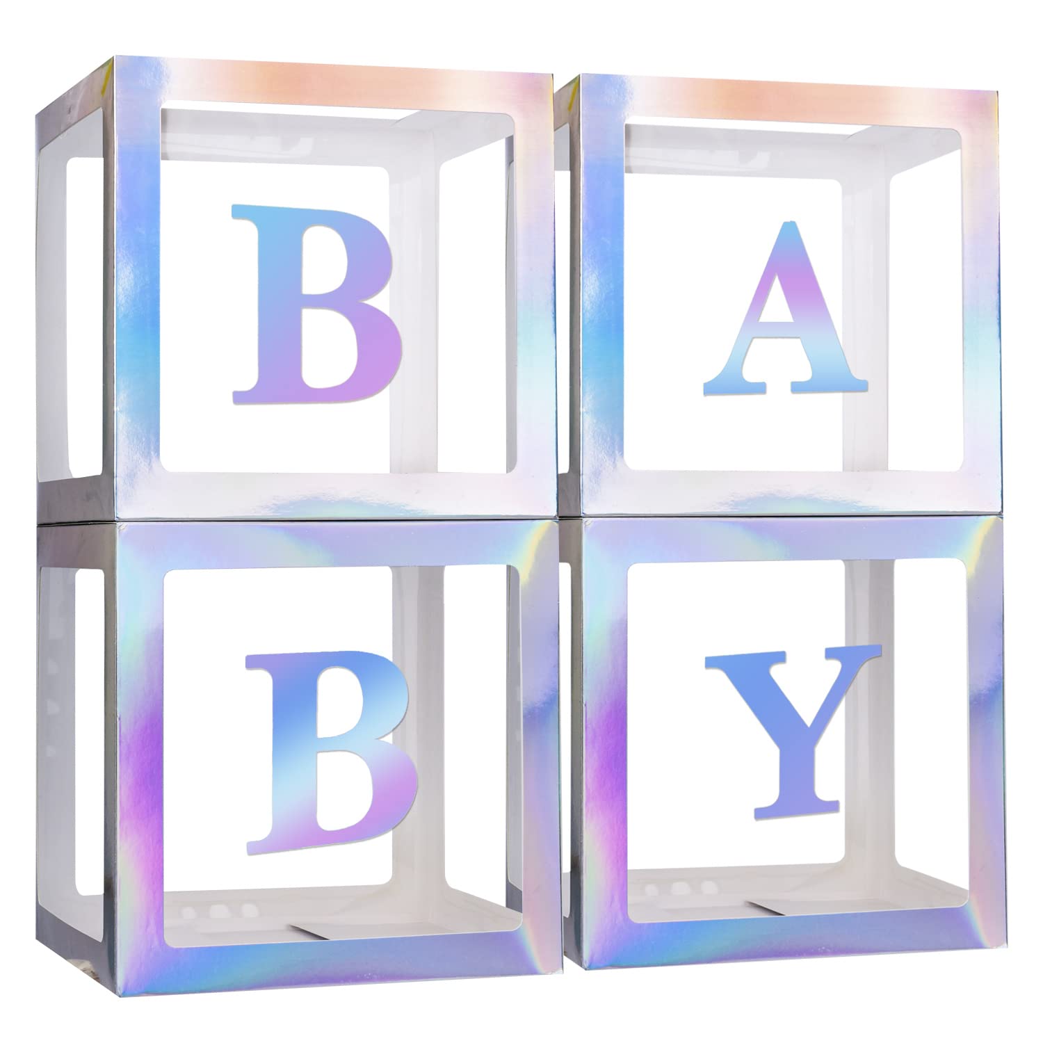 【BALLOON BOX PACKAGEINCLUED】:4pcs Rainbow Silver clear baby shower boxes,4 Rainbow Silver Letters“B” “A”“B”“Y”sticker,you can put other decorations into boxes to create a unique party by yourself,