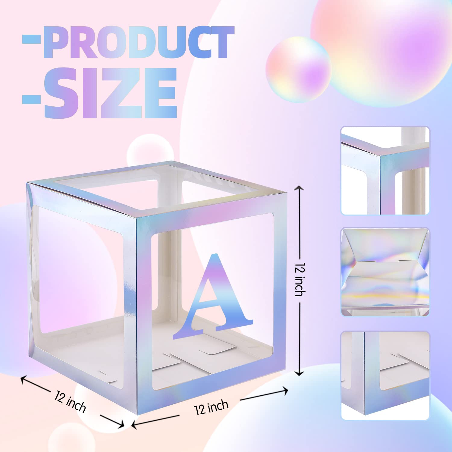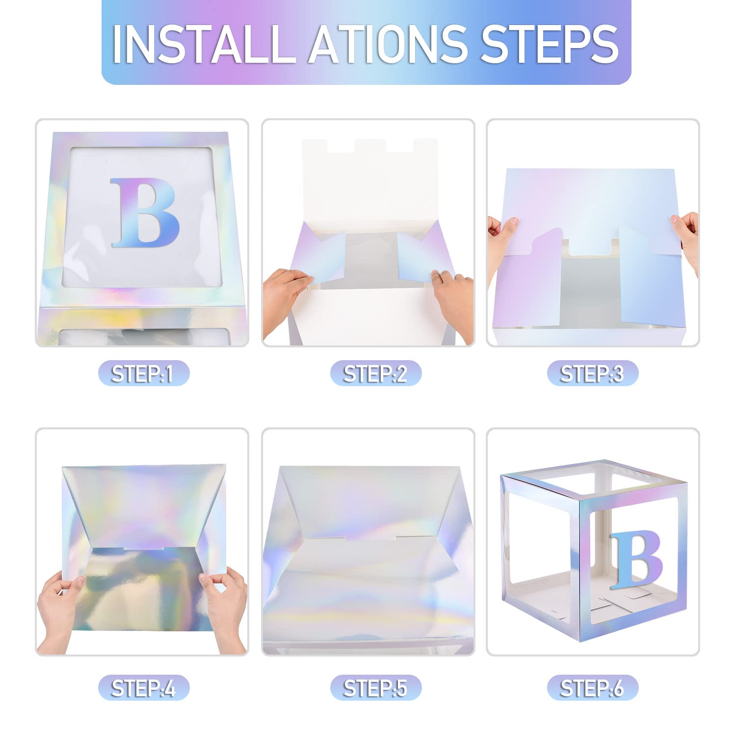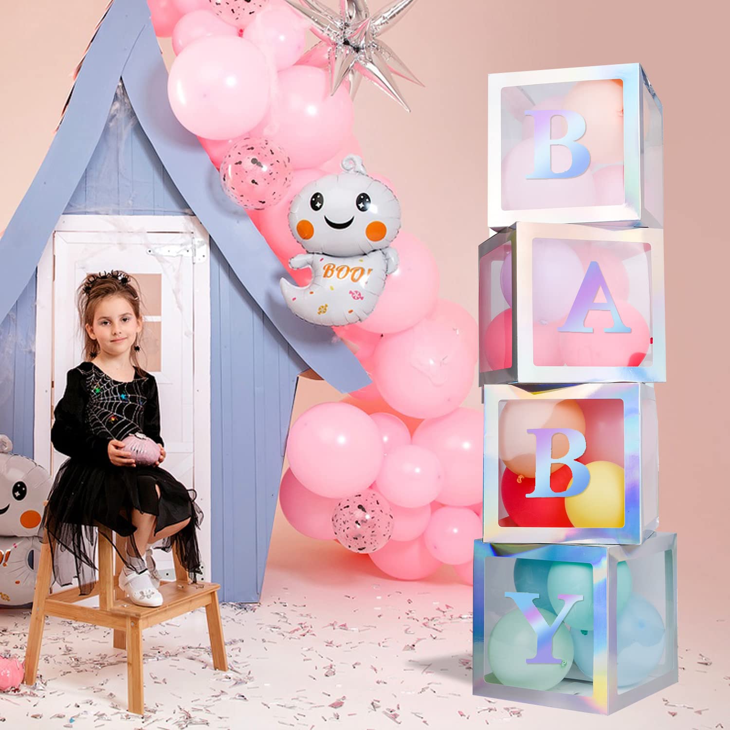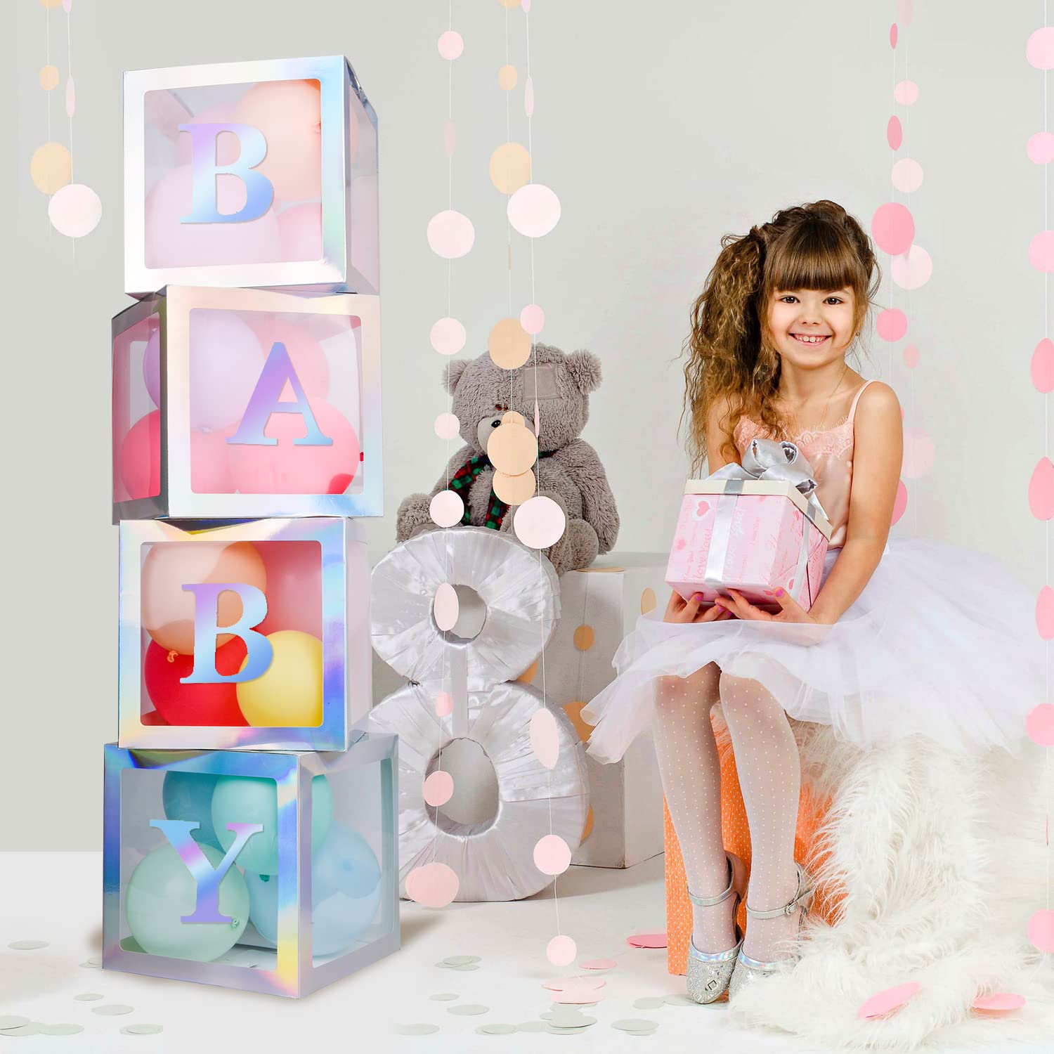 【BALLOON BOX PACKAGEINCLUED】:4pcs Rainbow Silver clear baby shower boxes,4 Rainbow Silver Letters“B” “A”“B”“Y”sticker,you can put other decorations into boxes to create a unique party by yourself,