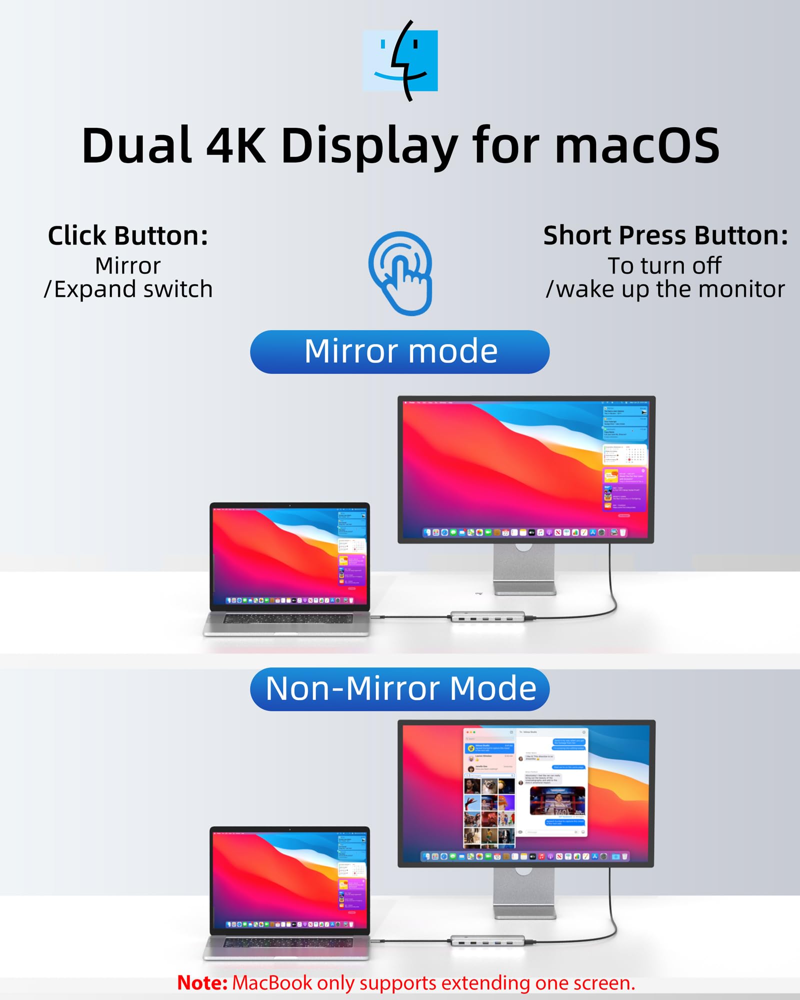 【13 in 1 USB C Docking Station】Plug and play. With this usb c hub multiple adapter, you get 2*4K HDMI, DisplayPort, 2*USB C ports(Both support 100W Power Delivery+10Gbps Data Transfer), USB 3.1(10Gbps), 3*USB 3.0, 2*USB 2.0, 3.5mm Audio, Gigabit Ethernet portprotective case may interfere the hub's function and Only support MacBook Laptop