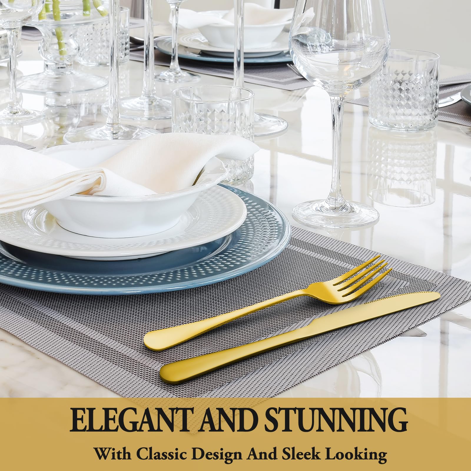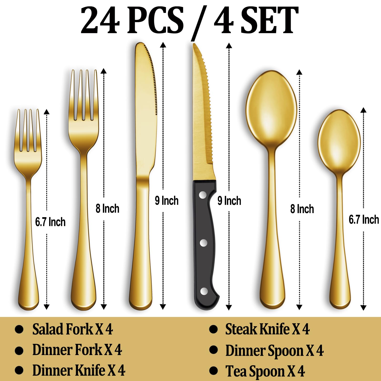 24 PCS GOLD SILVERWARE SET FOR 4: This gold silverware set comes with 4 Dinner Knife, 4 Steak Knives, 4 Dinner Forks, 4 Dinner Spoons, 4 Salad/Dessert Fork and 4 Dessert/Tea Spoons, essential for families or restaurants. The set is also an irreplaceable dining tool whether it is for daily use or for preparing dinners or parties.