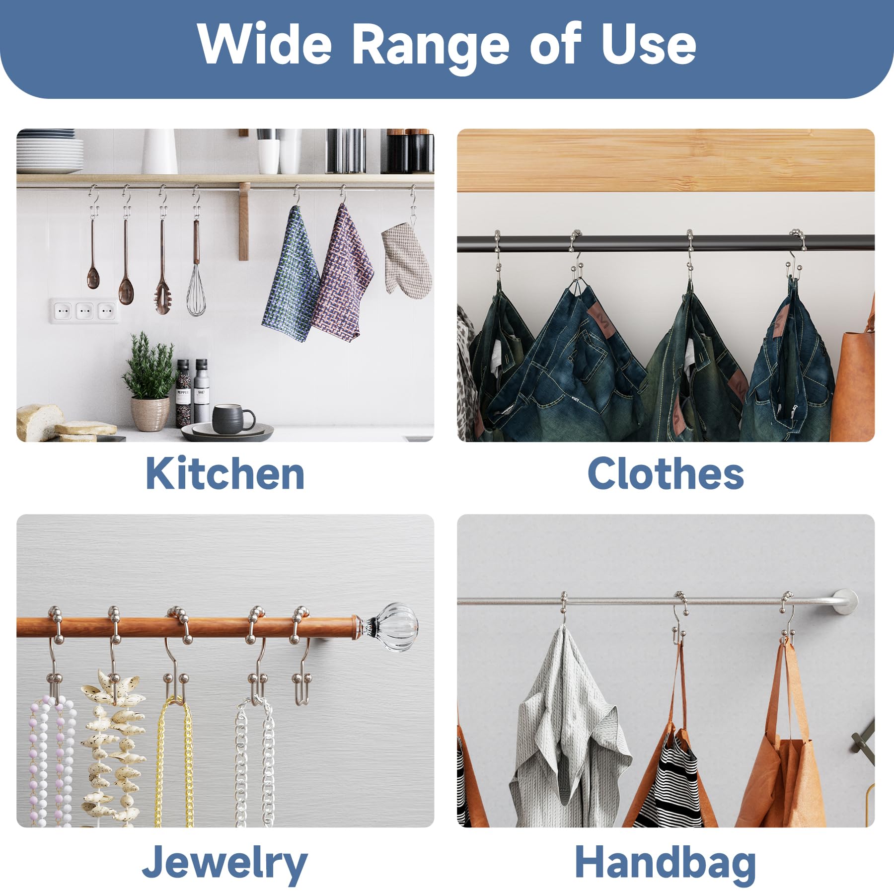 Double hooks design - The double roller glide shower hooks are strong enough to hold up shower curtain and shower liner.