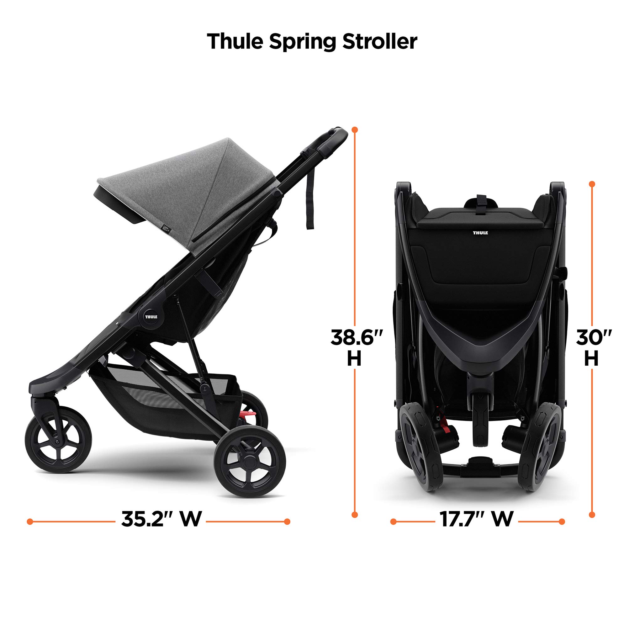 Meet the world with your child using the Thule Spring - a lightweight and compact stroller made for motion. This 3 wheel stroller allows you to easily navigate narrow urban streets, shop for groceries or meet up with friends. Designed with an easy one-hand fold to quickly close even when carrying a child. Thule Spring is 30% smaller than traditional 3 wheel strollers, and it's unique 3D compact fold and self-standing capability make it easy to carry, transport and store when not in use. This single stroller comes with all of the safety feature you expect from Thule. The reclining seat with a 5-point harness provides safety and comfort for strolling and napping on the go. No puncture, foam filled tires provide a smooth ride on any terrain. The swiveling front wheel with suspension can be locked into a fixed position for a comfortable ride anywhere. The vented canopy is fully adjustable and extends for low sun coverage, while also providing UPF 50+ UV protection for your little one. The sliding handlebar adjusts with one hand for ultimate comfort. Finally, the Thule Spring is compliant with Walt Disney World Theme park regulations, making it the perfect travel stroller for any family vacation.