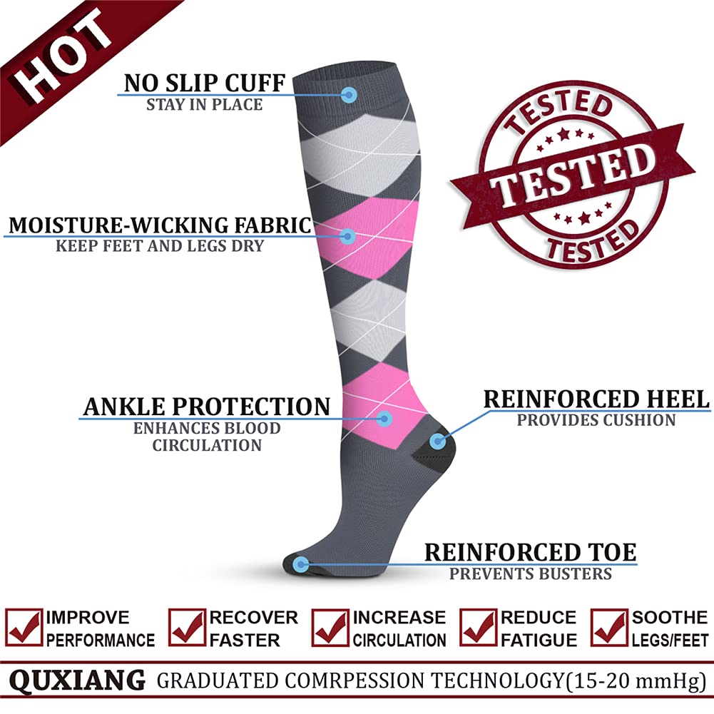 COMPRESSION BENEFITS - QUXIANG Compression socks are designed to promote blood circulation and oxygen flow preventing fatigue and helps in muscle recovery. Whether you are an athlete, sportsperson, teacher, flight crew, receptionist, office worker, pregnant, recovering patient, nurturing mother, elderly, our socks are universally suitable for all work.