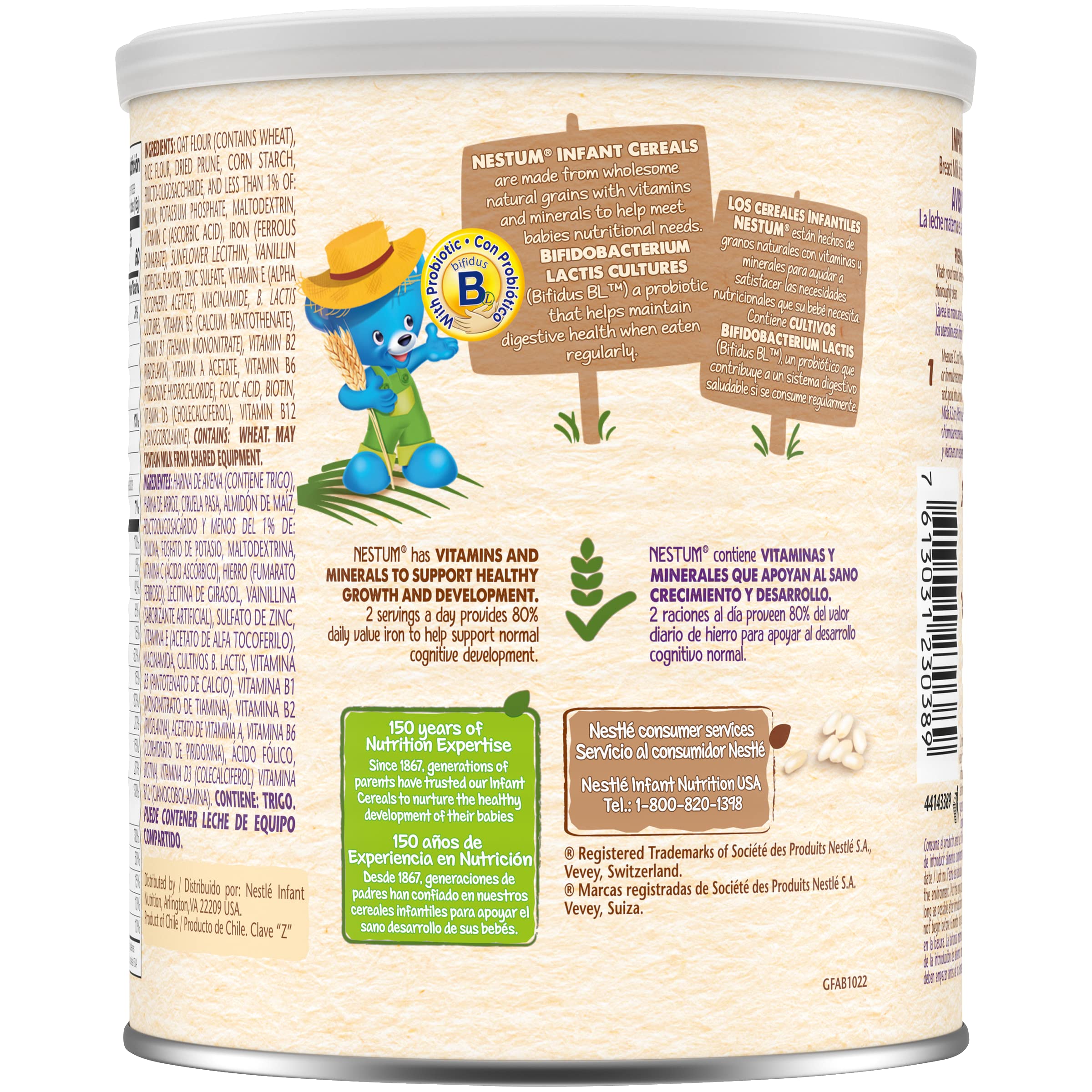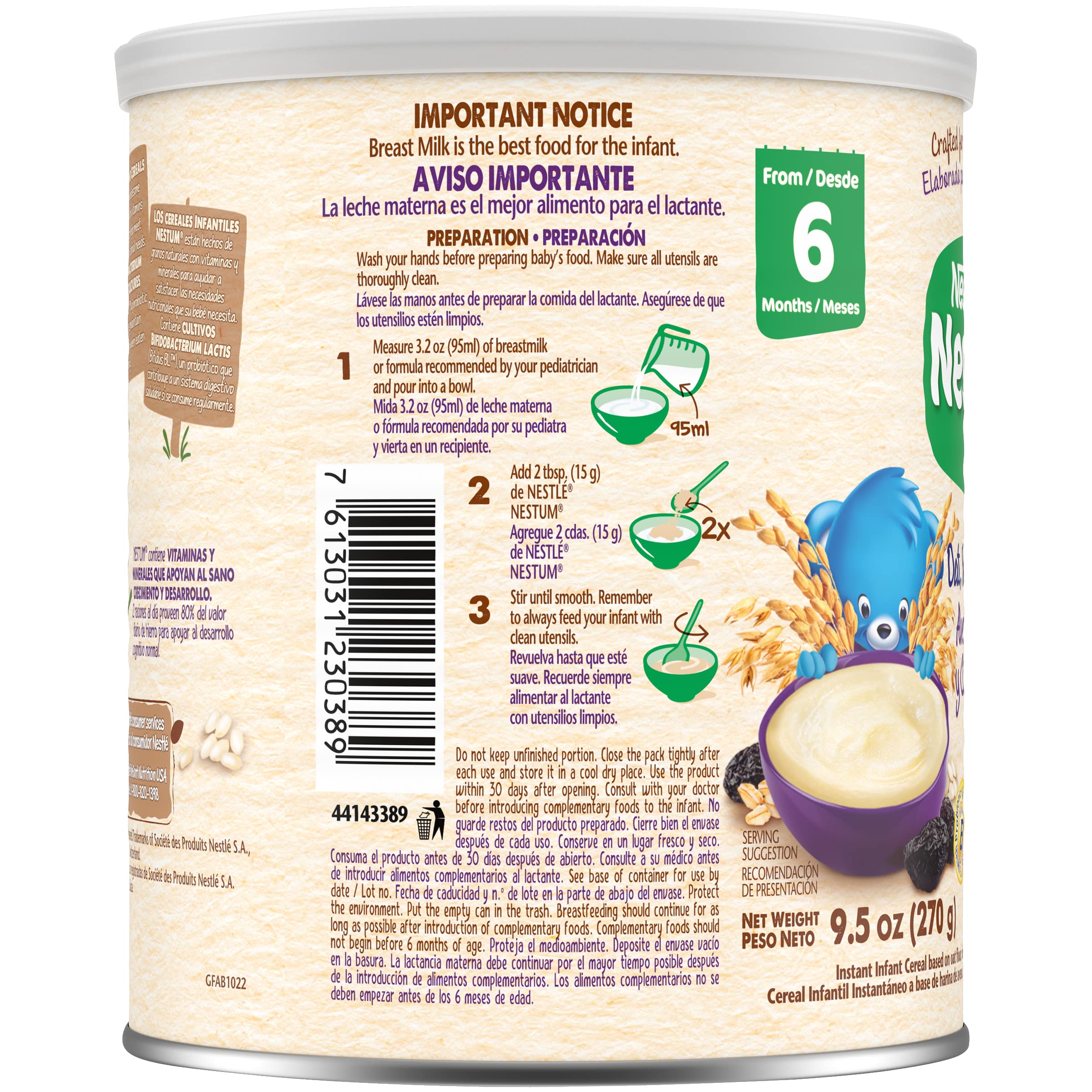 Nestle Nestum Infant Cereal - Oat, Rice & Prune, 9.5 Ounce Canister: Made for infants, 6 months. Crafted with delicious ingredients to help your little one blossom. Nestum is made with wholesome grains and vitamins and minerals to support healthy growth, including iron to help support brain development and learning ability. Our cereals are made with wholesome ingredients. Also, they are easy to prepare for a satisfying cereal for your little one. With a range of cereals made for little ones from 6-12+ months, there’s a Nestum product to help nourish little tummies of all ages.