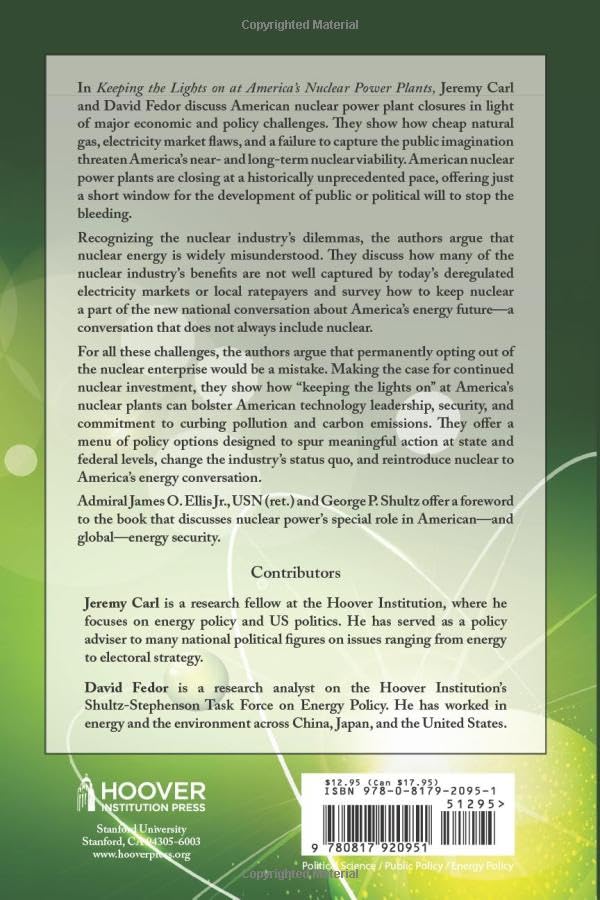 In Keeping the Lights On at America's Nuclear Power Plants, Jeremy Carl and David Fedor discuss the decline of American nuclear power in light of major economic, technological and political challenges. They show how high costs, low public support, and popular clean energy trends threaten America's near- and long-term nuclear viability. American nuclear power plants are closing at a historically unprecedented pace, and there's little evidence of public or political will to stop the bleeding. Recognizing the nuclear industry's flaws, the authors argue that nuclear energy is widely misunderstood. They discuss the nuclear industry's failure to capture the public's attention and imagination, and survey the new national conversation about America's renewable energy future -- a conversation that does not include nuclear. For all these challenges, the authors argue that permanently opting out of the nuclear enterprise would be a mistake. Making the case for continued nuclear investment, they show how "keeping the lights on" at America's nuclear plants can bolster American technology leadership, security, and commitment to curbing carbon emissions. They offer a menu of policy options designed to spur meaningful action at state and federal levels, to change the industry's status quo, and to reintroduce nuclear to America's energy conversation.