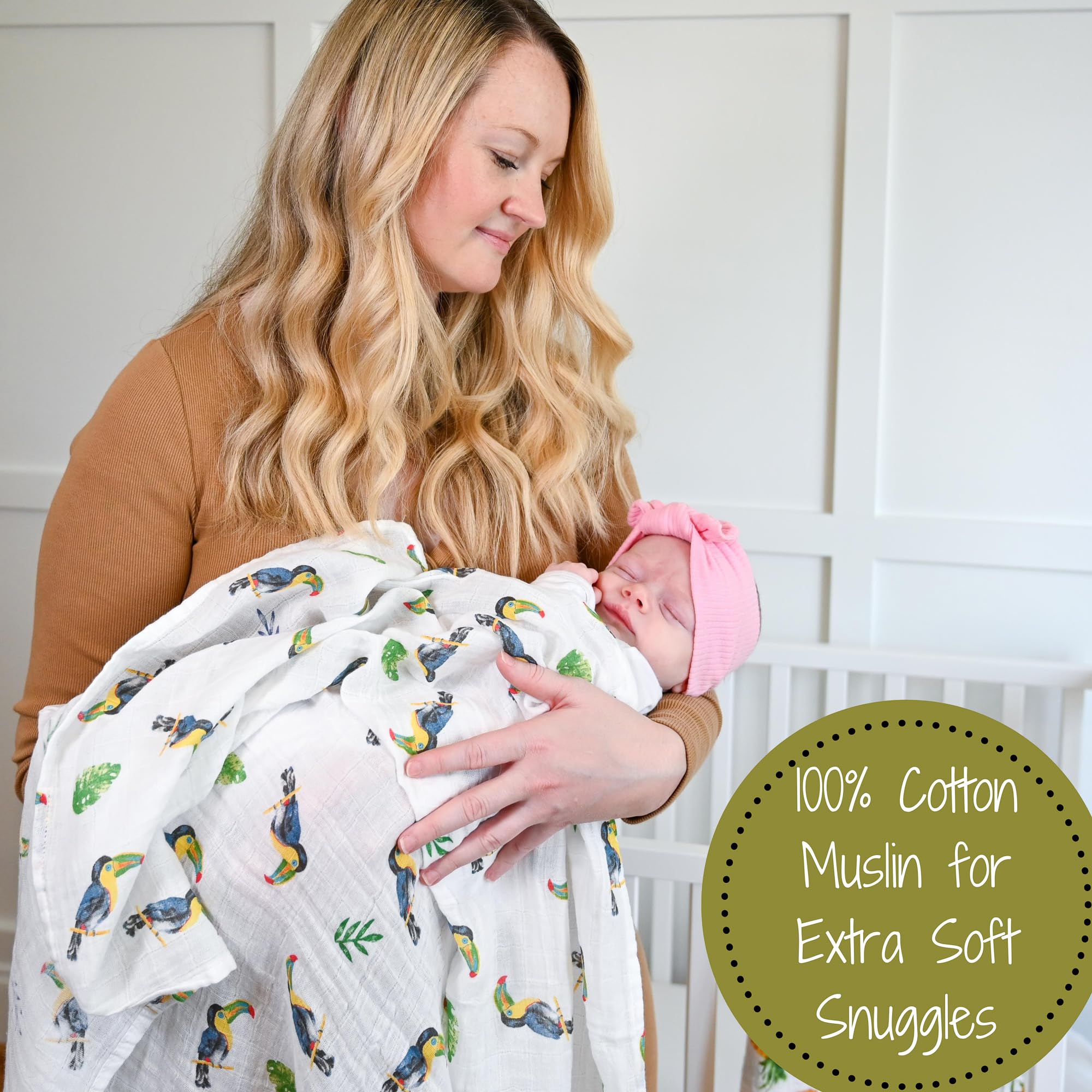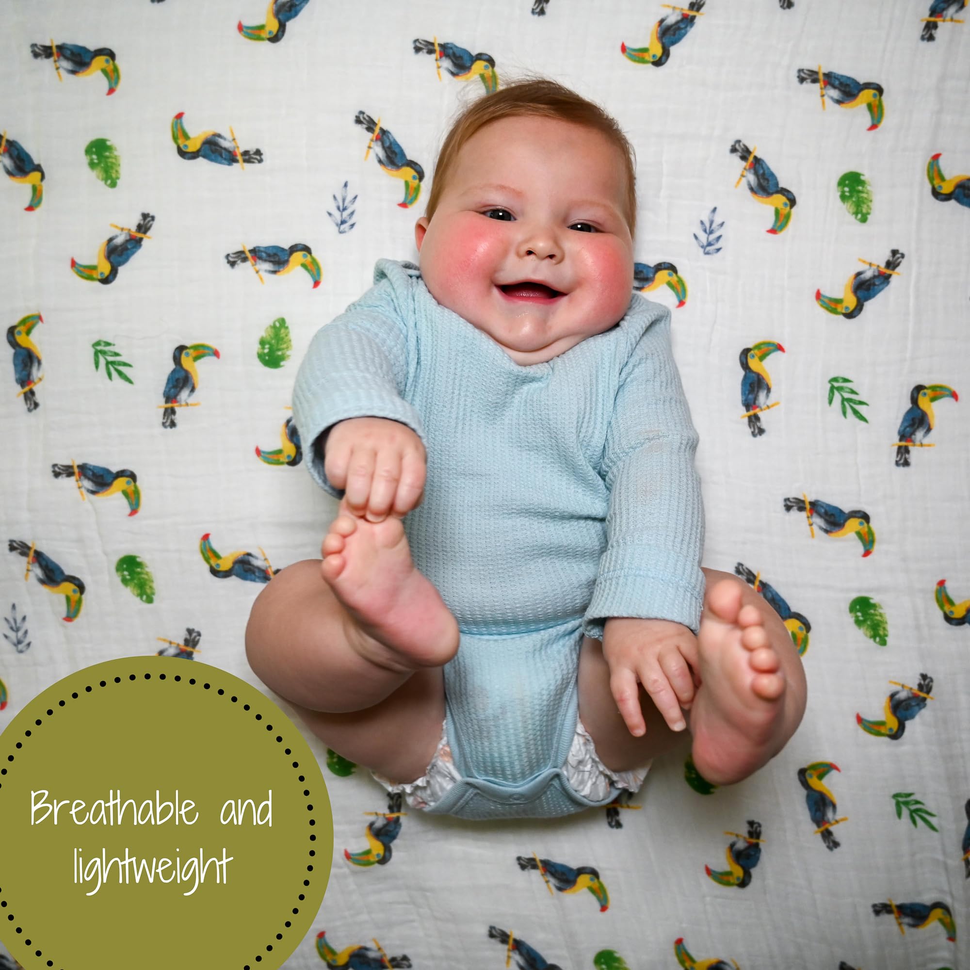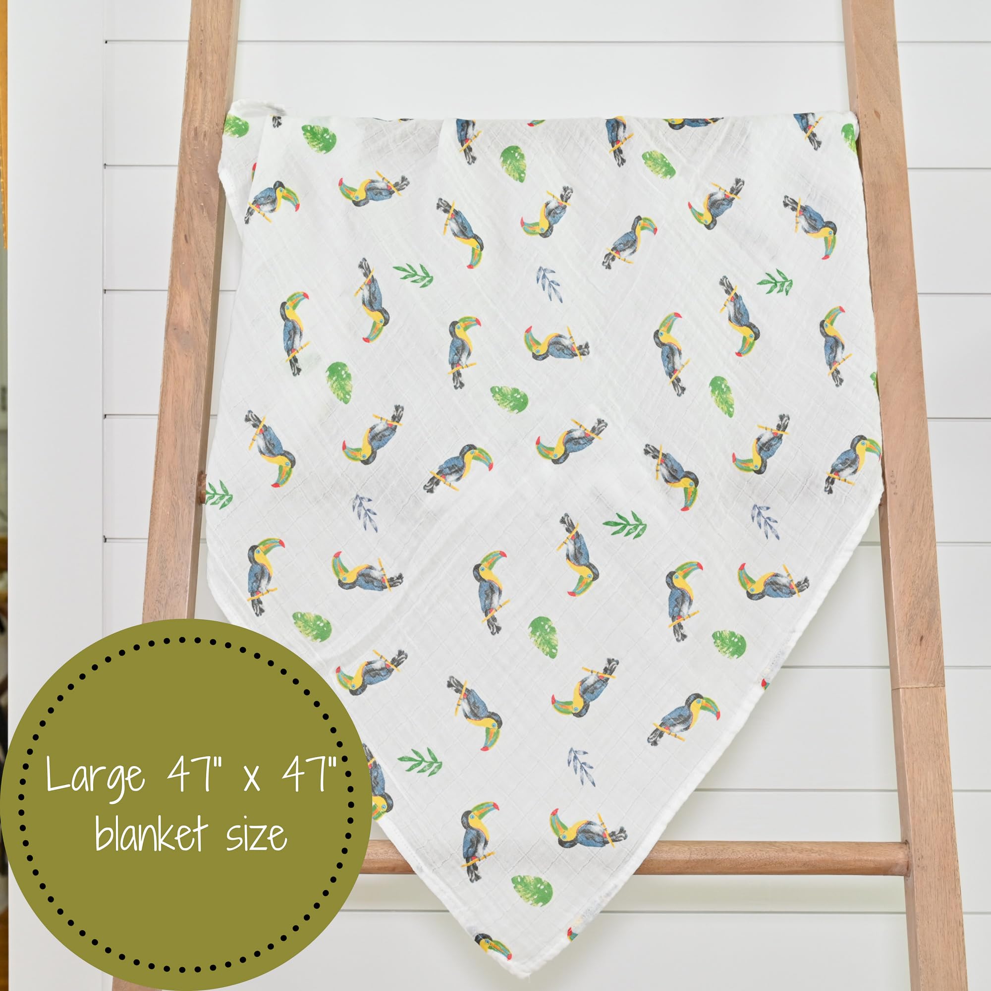TROPICAL TOUCAN SWADDLE - Vibrant toucans with their colorful beaks brighten up this blanket, bringing a tropical vibe to your baby’s world. Symbolizing freedom and joy, it’s the perfect choice for cozy naps, playful moments, and adding a splash of color to every cuddle