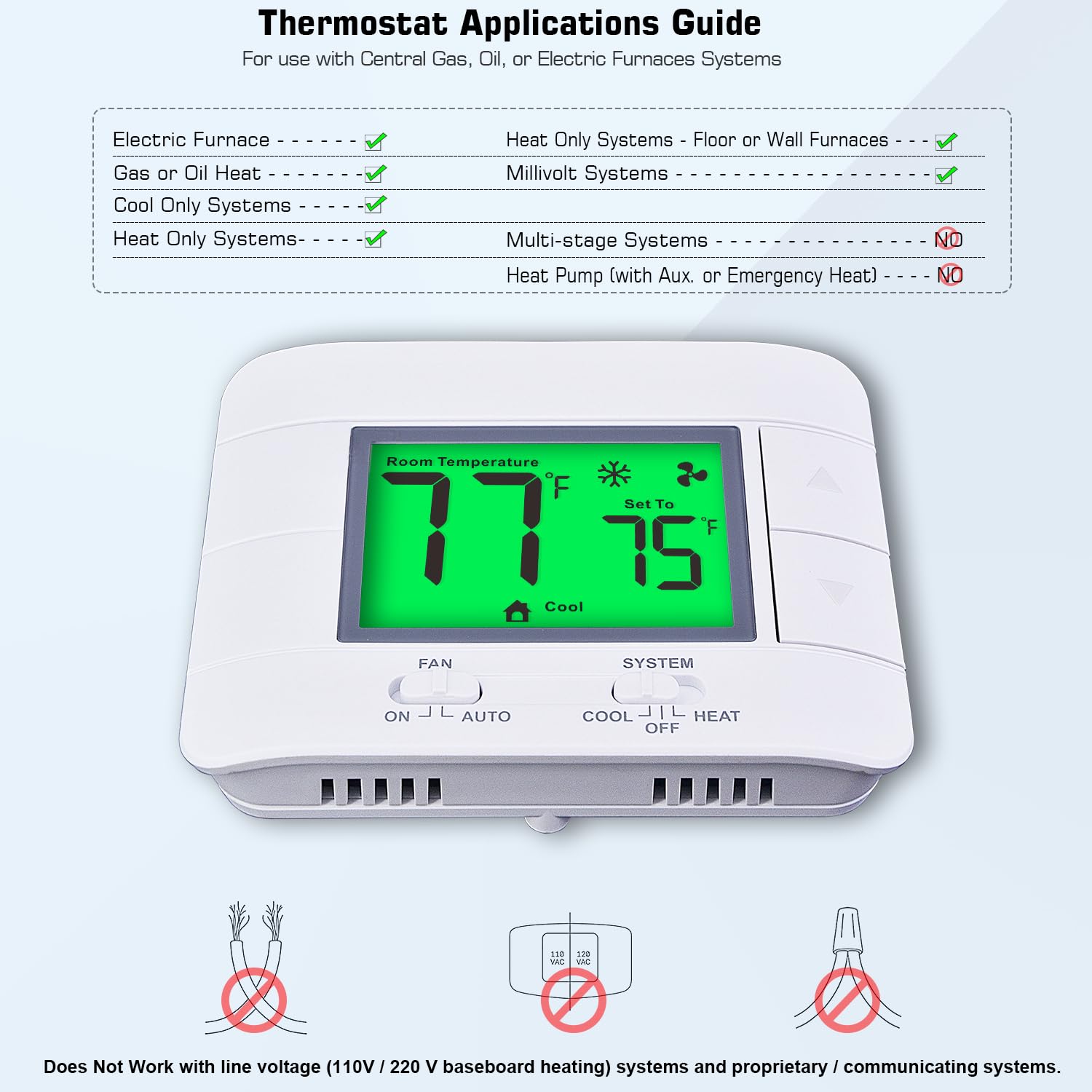 Compatible with single stage system: gas, oil or electric furnaces, millivolt system, central heating and cooling system. Does NOT work with electric baseboard heat (120-240V).