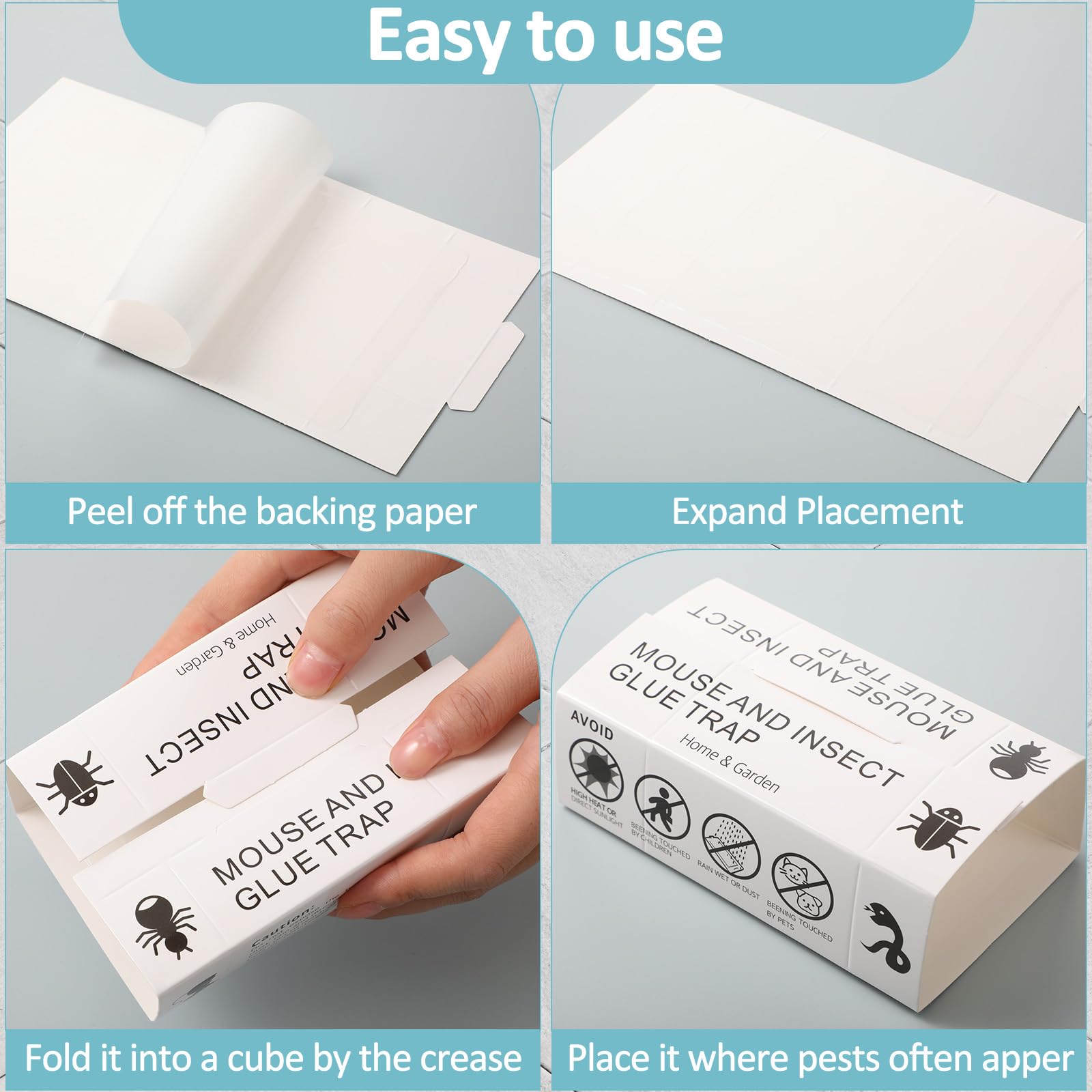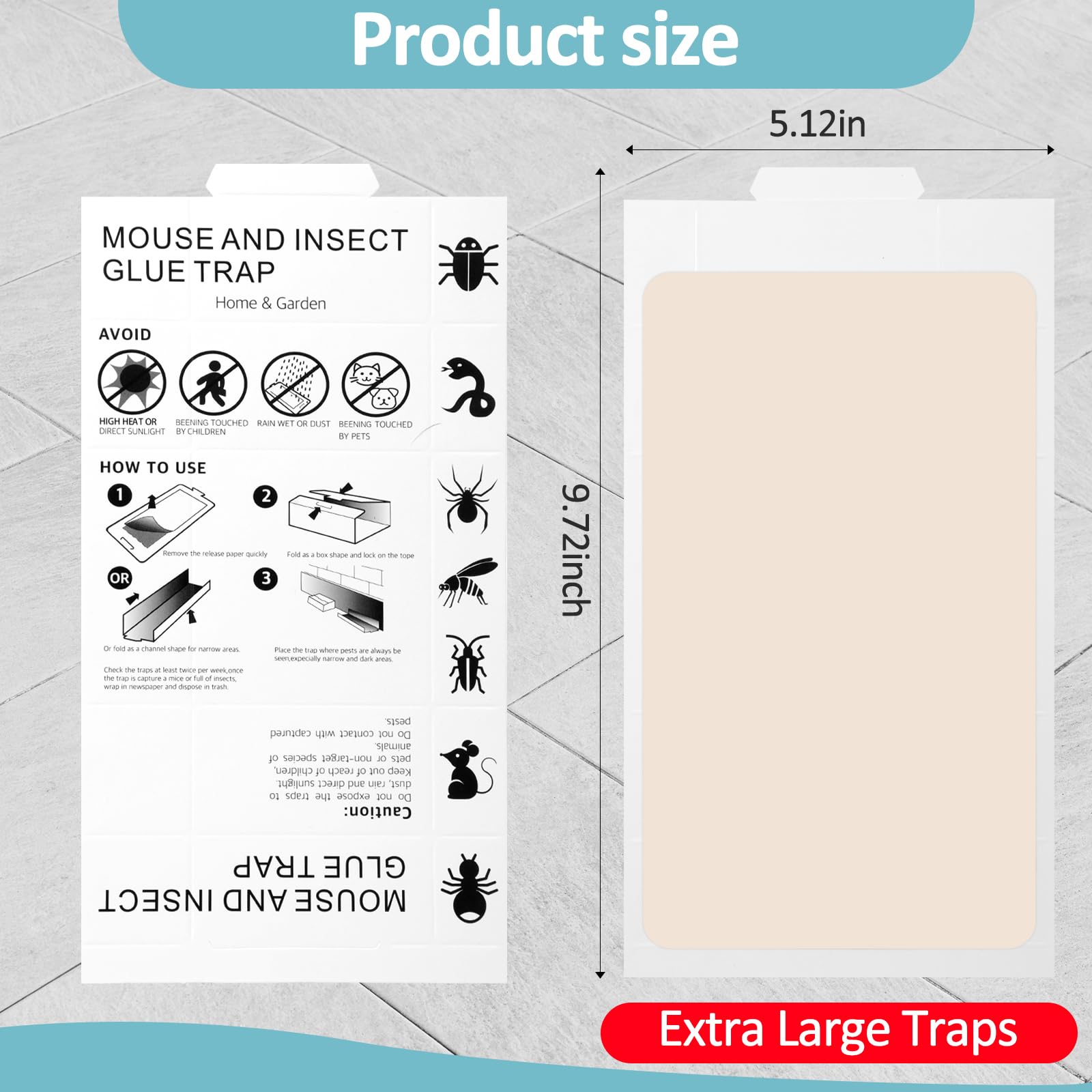 Double Way to Use: this bug glue traps bulk can be applied in folded or laid; Simply put the trap against walls or along pathways to catch rats and pest; However, if you use house spider trap in an area with dust or other debris, please fold the trap into a tunnel to protect the glue