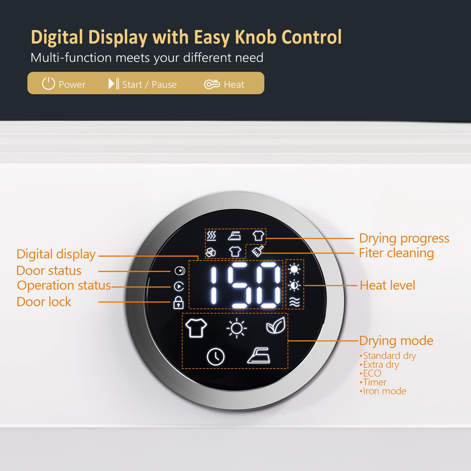 【Saving Time and Effort】This washer and dry set helps free you from housework. All you need to do is to put your clothes in the washer, spin them out and transfer them to the dryer, wait for the drying to finish and then you're ready to wear warm, soft and clean clothes. The dryer is designed with a circular digital screen, and all functions and operations are clearly listed on it, once you set your desired mode via the knob control, you could just leave it alone to work and do your own things.