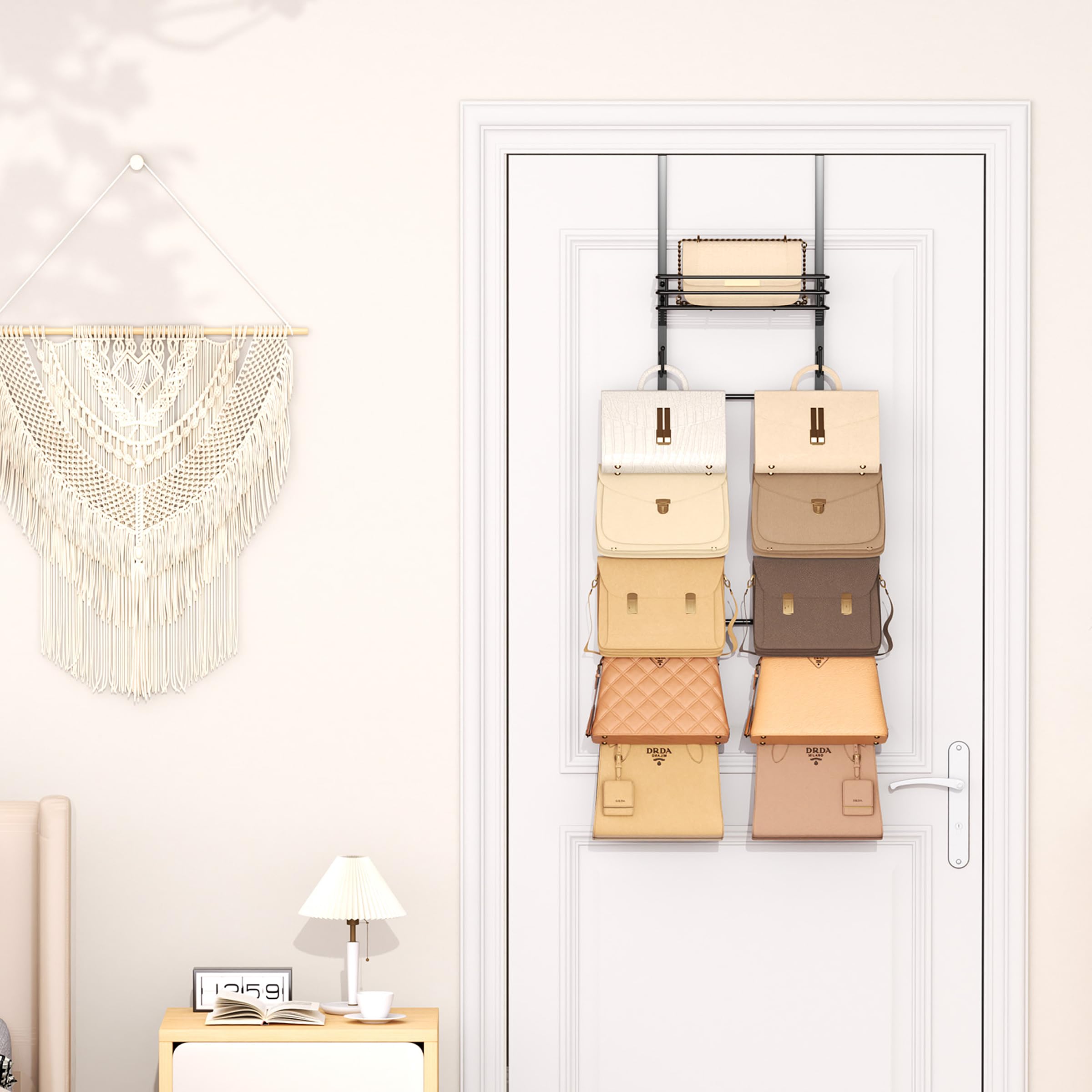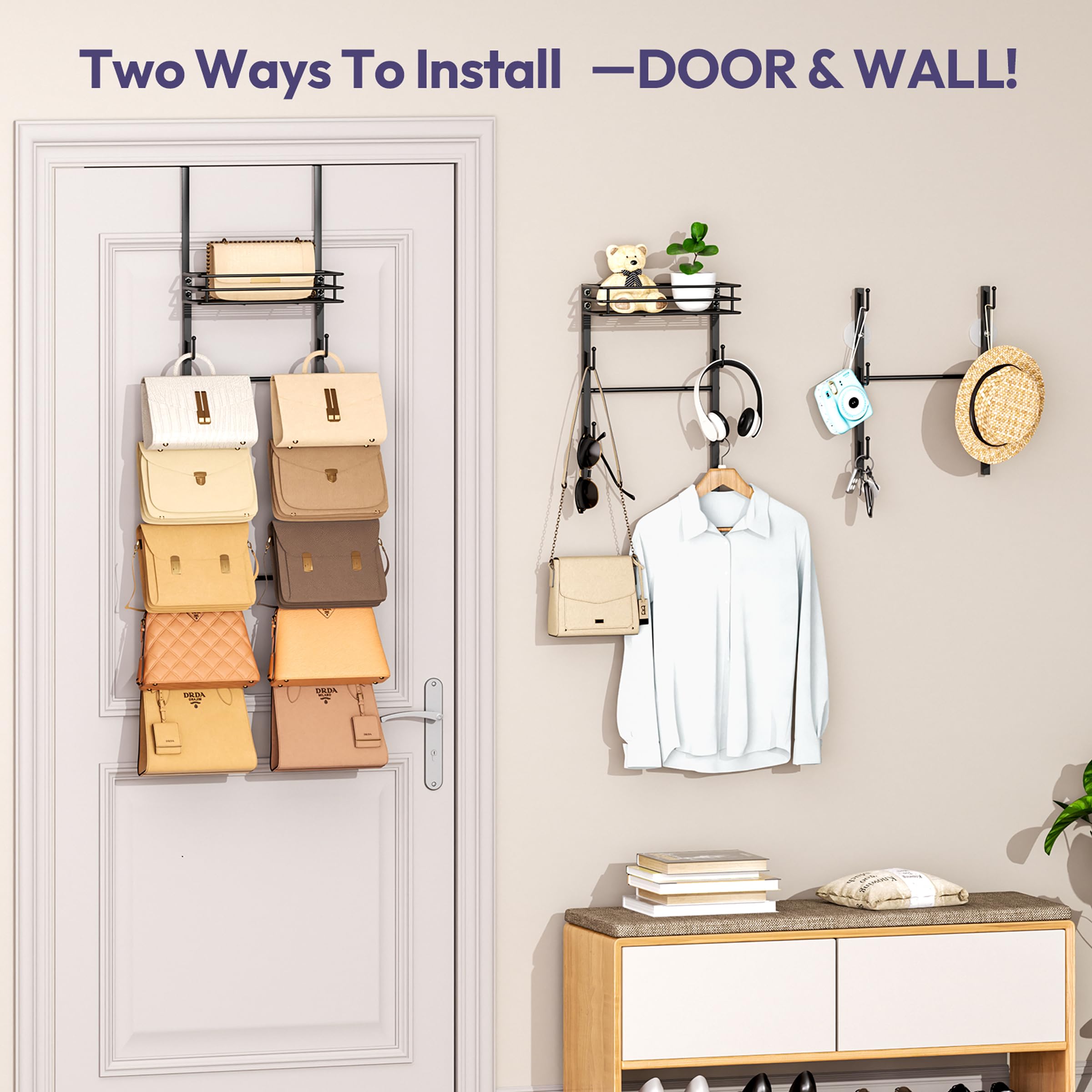 [Dual Installation Modes]: Choose what works for you—hang it over the door or mount it on the wall. This purse storage adapts to your space and style. Whether you're organizing everyday bags or weekend totes, this heavy-duty handbag storage system serves as a durable and elegant purse holder for homes, dorms, and studios