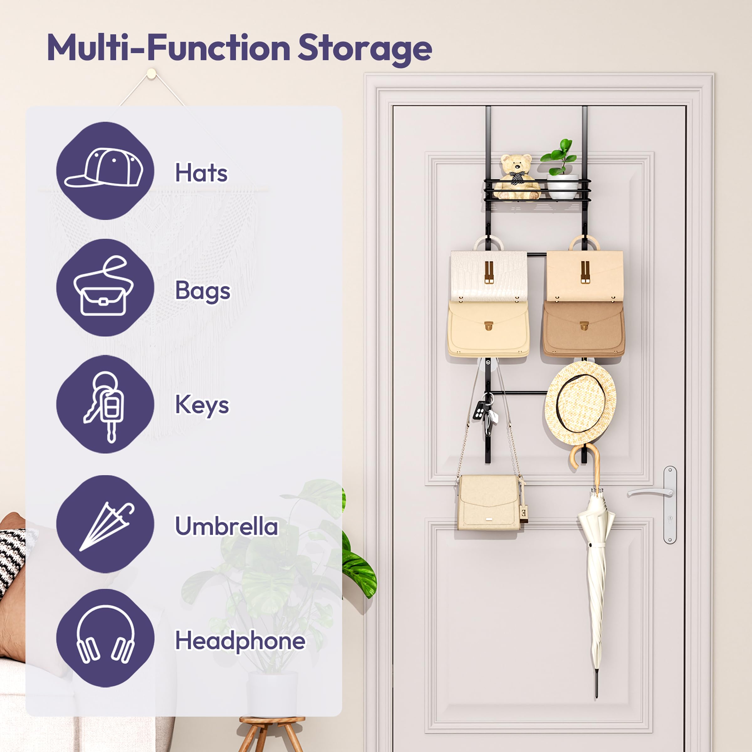 [Multi-Use Storage Option]: More than a handbag organizer, also work as hat rack, coat rack to stores hats, scarves, and even belts. Say goodbye to clutter with this functional purse rack, designed for those who love clean spaces. It's not just a rack—it's also a stylish purse shelf display that enhances any wall or door