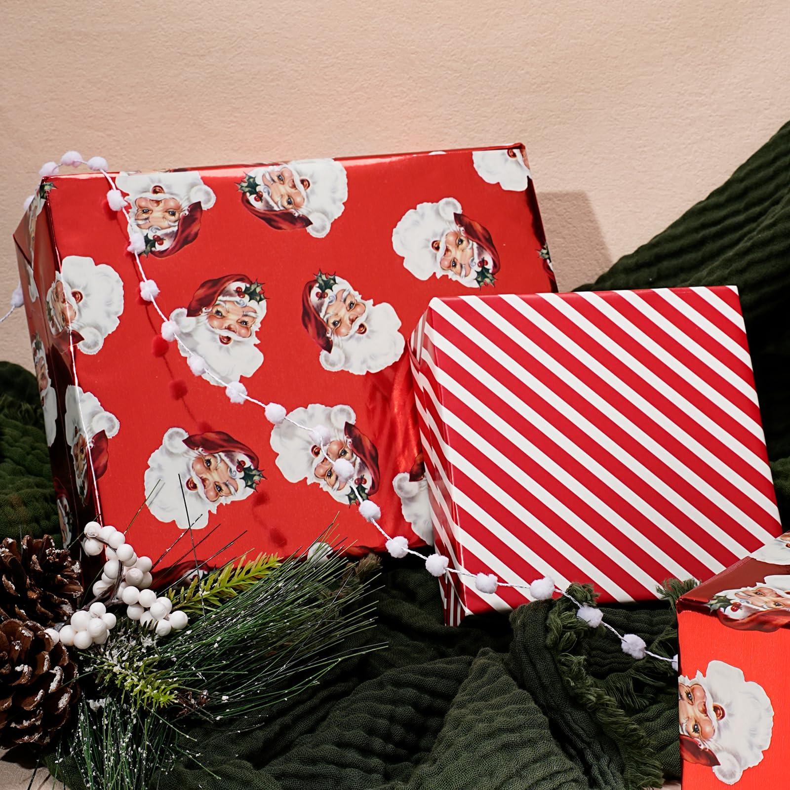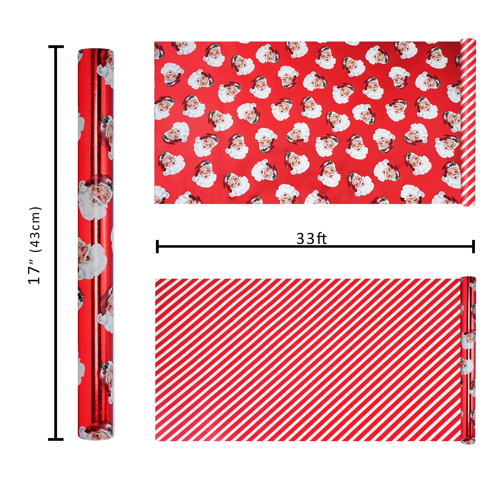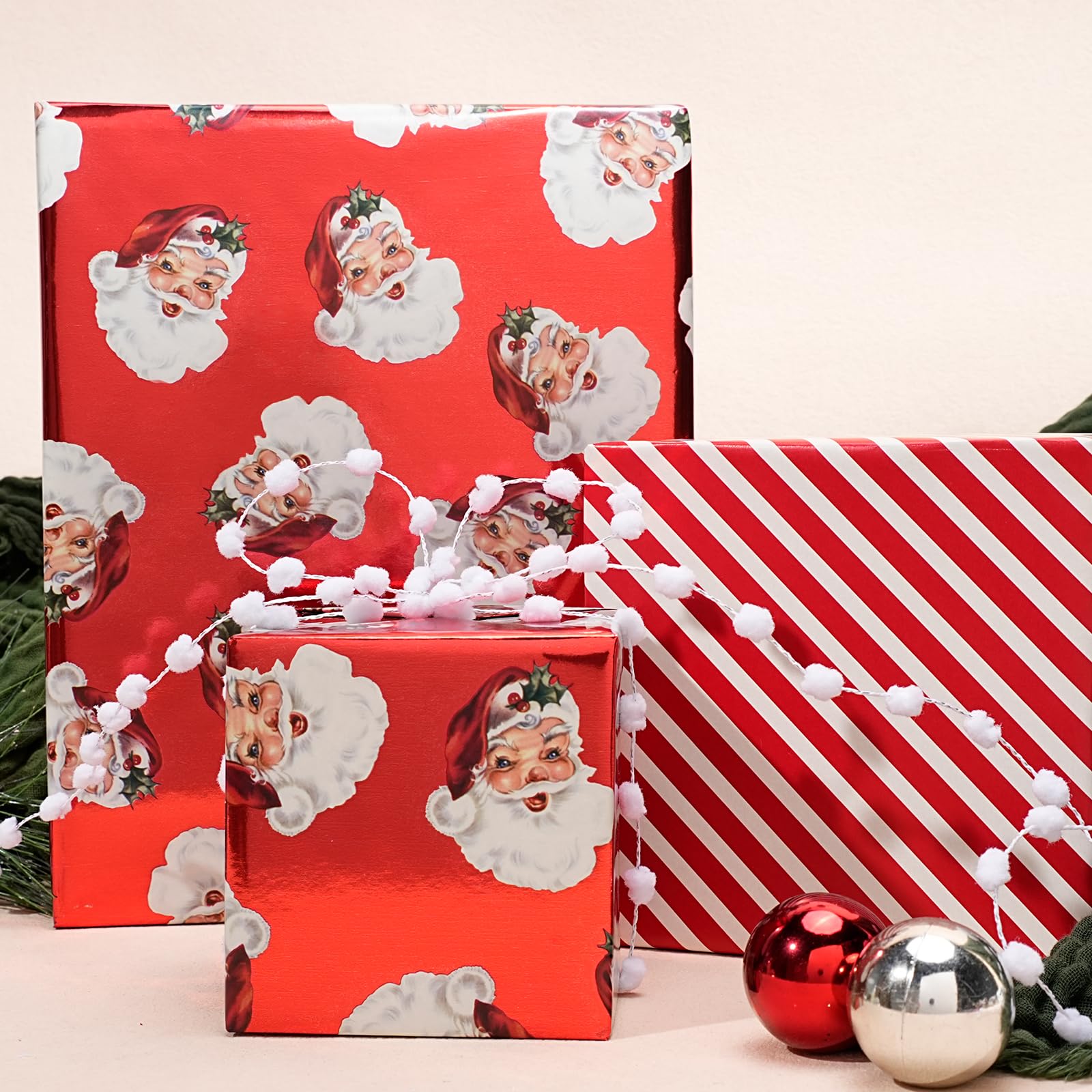 Double-Sided Foil Brilliance: One side sparkles with vintage Santa foil prints, while the other features candy cane stripes – giving you two stylish Christmas looks in one roll