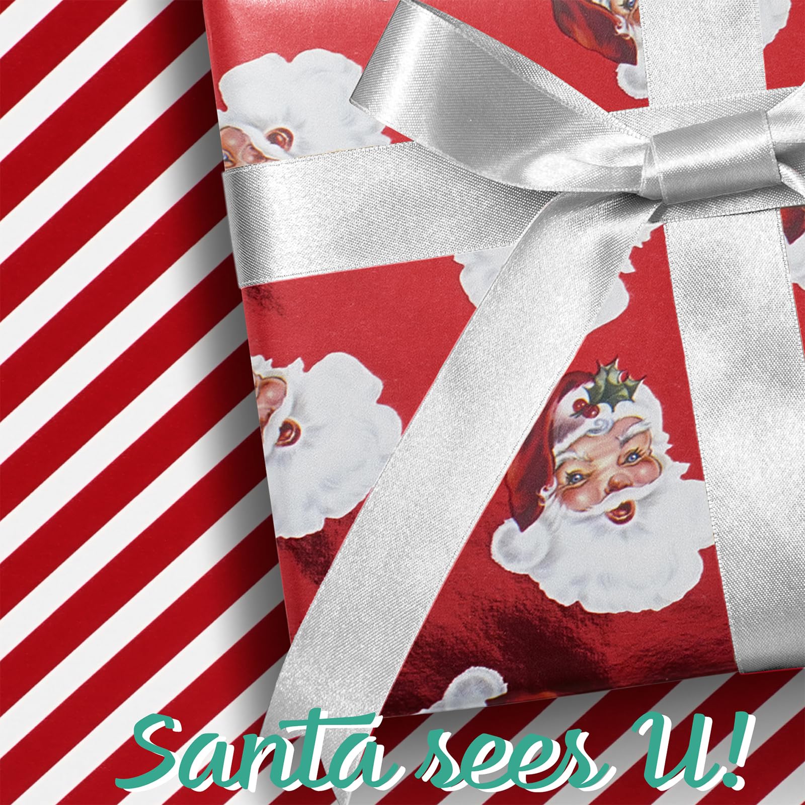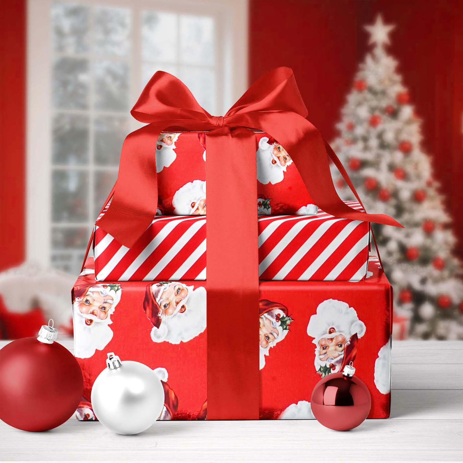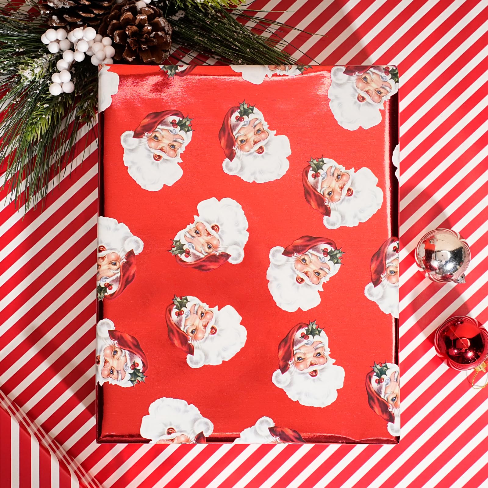 Double-Sided Foil Brilliance: One side sparkles with vintage Santa foil prints, while the other features candy cane stripes – giving you two stylish Christmas looks in one roll