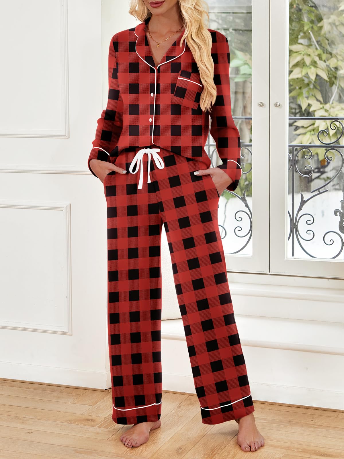 Fashion Design: Womens casual long sleeve v neck button down pajamas sets, pants with drawstring elastic design
