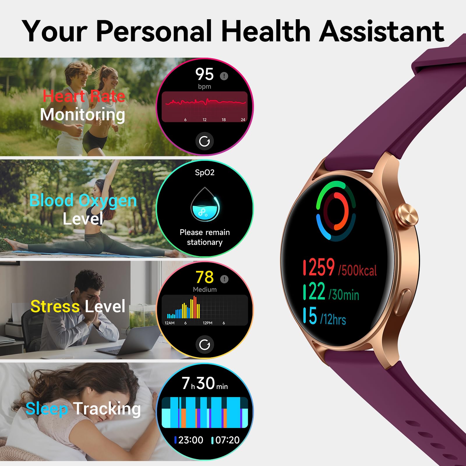 【Comprehensive Health Monitoring】This advanced fitness watch monitors your heart rate, SpO2 (blood oxygen) levels, breathing rate, stress management score and menstrual health.(Non-medical use) Sleep smarter by automatically recording your nightly rest, including light, deep, and REM sleep stages