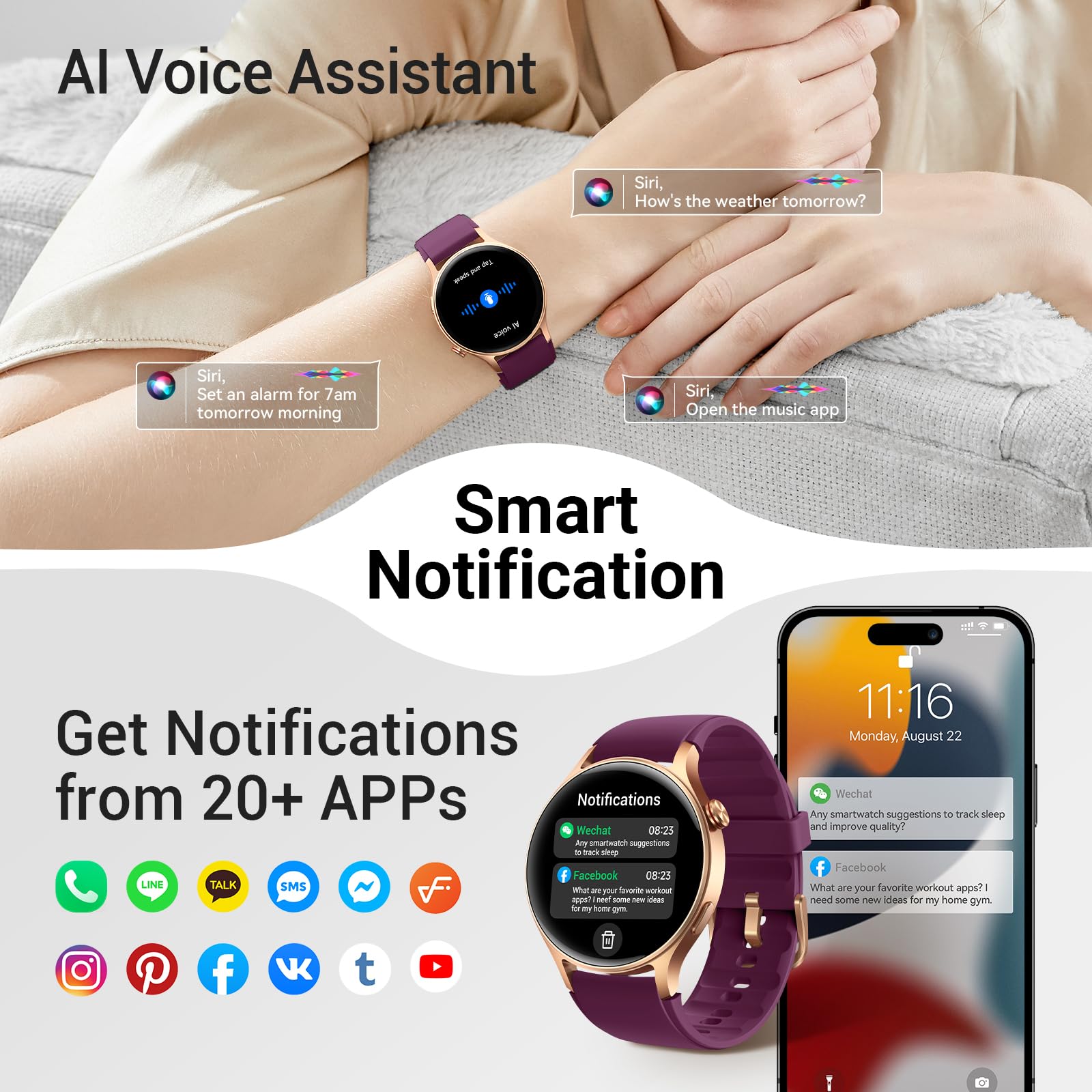 【Long-Lasting Battery】 Enjoy up to 10+ days of battery life on a single charge. With AI intelligent voice control, this digital watch is more than just a womens watch—it's a lifestyle companion for women