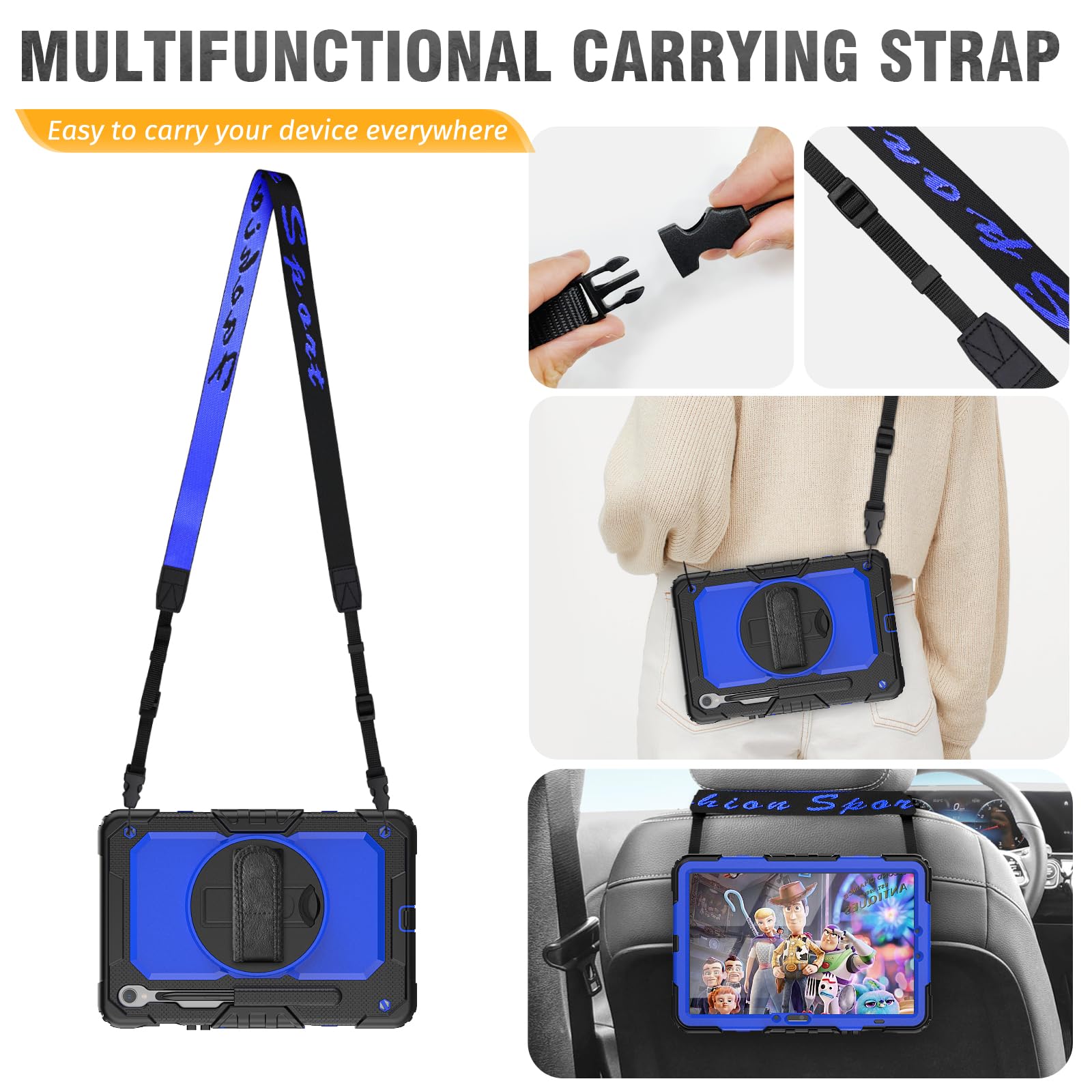 Shoulder Strap & S Pen Holder — Detachable and adjustable shoulder strap, easy to carry the tab s10 lite around. Especially ideal for traveling! You can hanging it on the back of the seat use as a TV. The S Pen holder can always keep the pen secure in place.