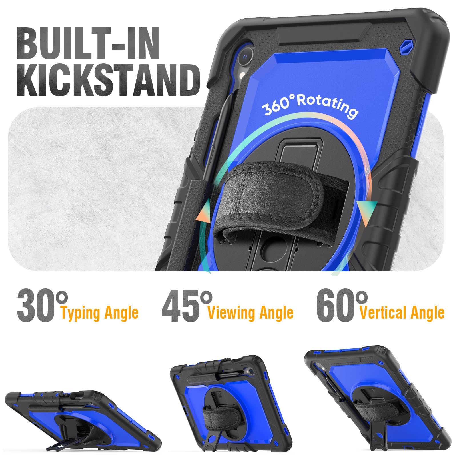 360° Rotating Stand & Hand Strap — The adjustable stand provides a stable support on viewing/drawing/typing angles. The Hand Strap allows you hold it safely by one hand, Perfect for use your tablet while lying down or sitting.