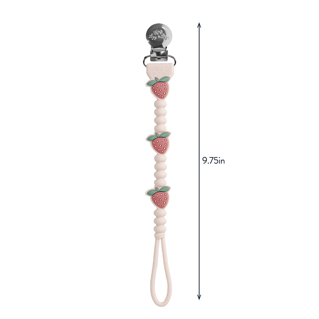 Meet the stylish yet practical silicone pacifier holder from Itzy Ritzy. Crafted from 100% food-grade silicone, this durable accessory ensures pacifiers stay securely in place, offering peace of mind for parents on the go. The sleek one-piece design boasts trendy beaded detailing and an adorable strawberry character, adding a touch of flair to your little one's ensemble. With a gentle clasp that won't snag on clothes and an adjustable silicone cord compatible with various pacifiers, teethers, or toys, convenience meets safety in one adorable package. Designed for infants from birth onwards and meeting ASTM safety standards, this BPA and PVC-free accessory measures 9.75 inches in length, providing both fashion and function for your precious bundle of joy.