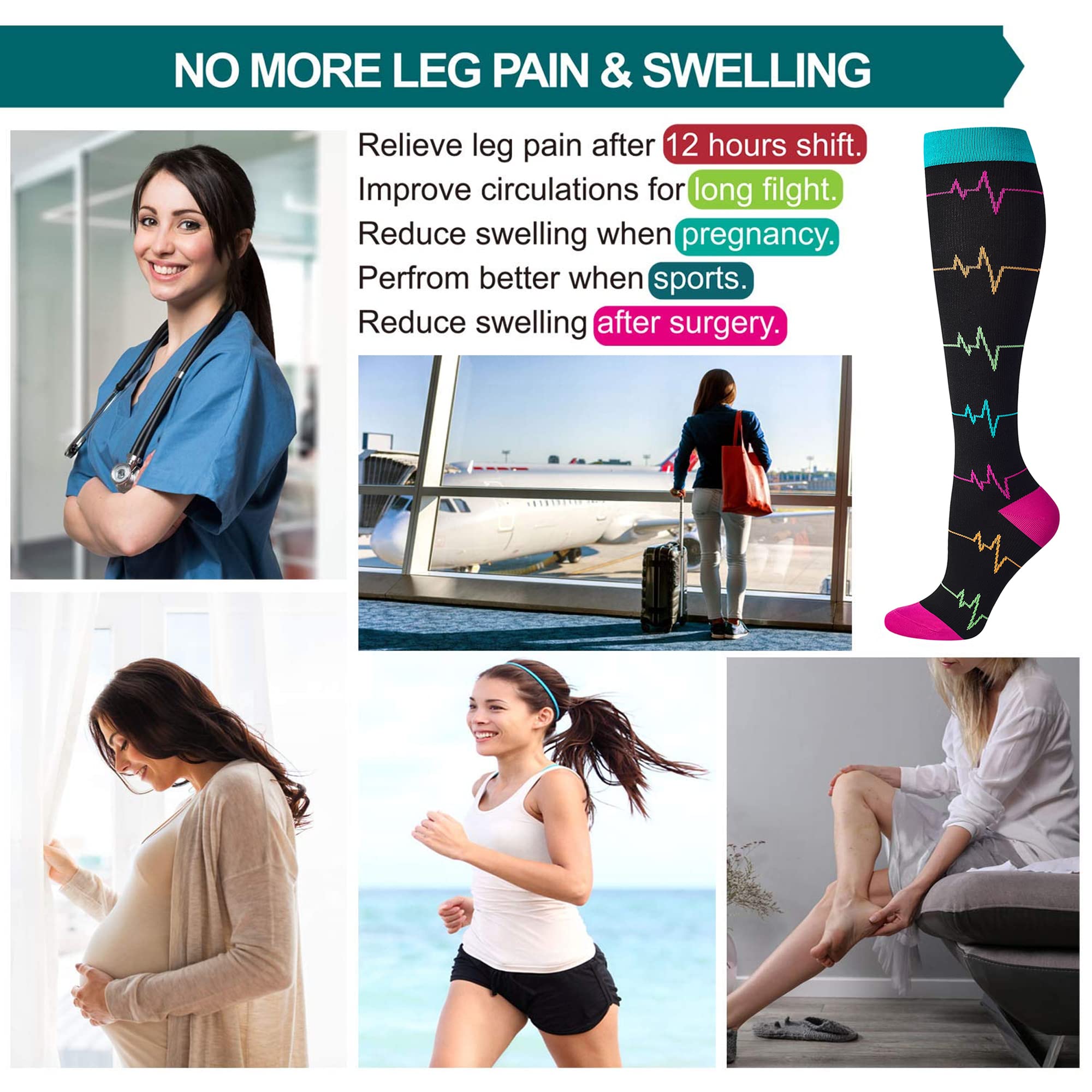 BEST NURSING COMPRESSION SOCKS WOMEN AND MEN. The compression support is perfectly located on where it is needed. The toe area has a specially made pocket, it won't squeeze toe joints. Moisture wicking properties for added comfort. After a 24 hour shift, legs don't feel heavy, wont have swelling. Quality compression stocking, easy care and wash well without losing compression, longer service life.