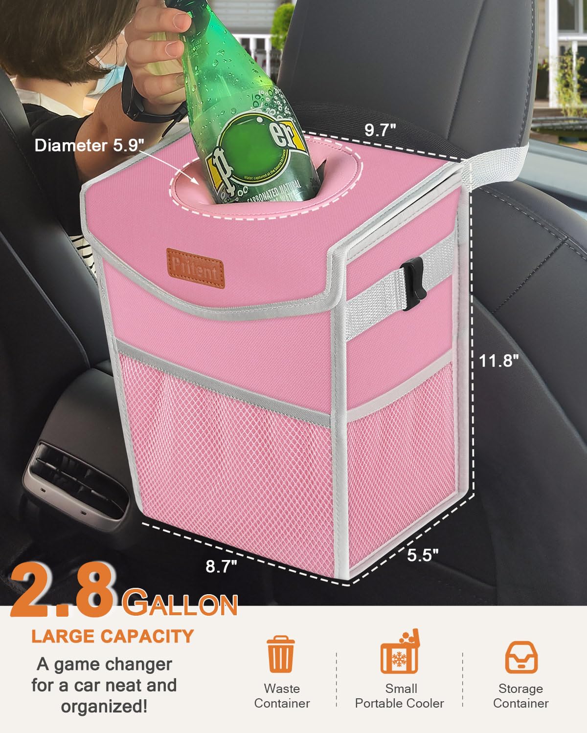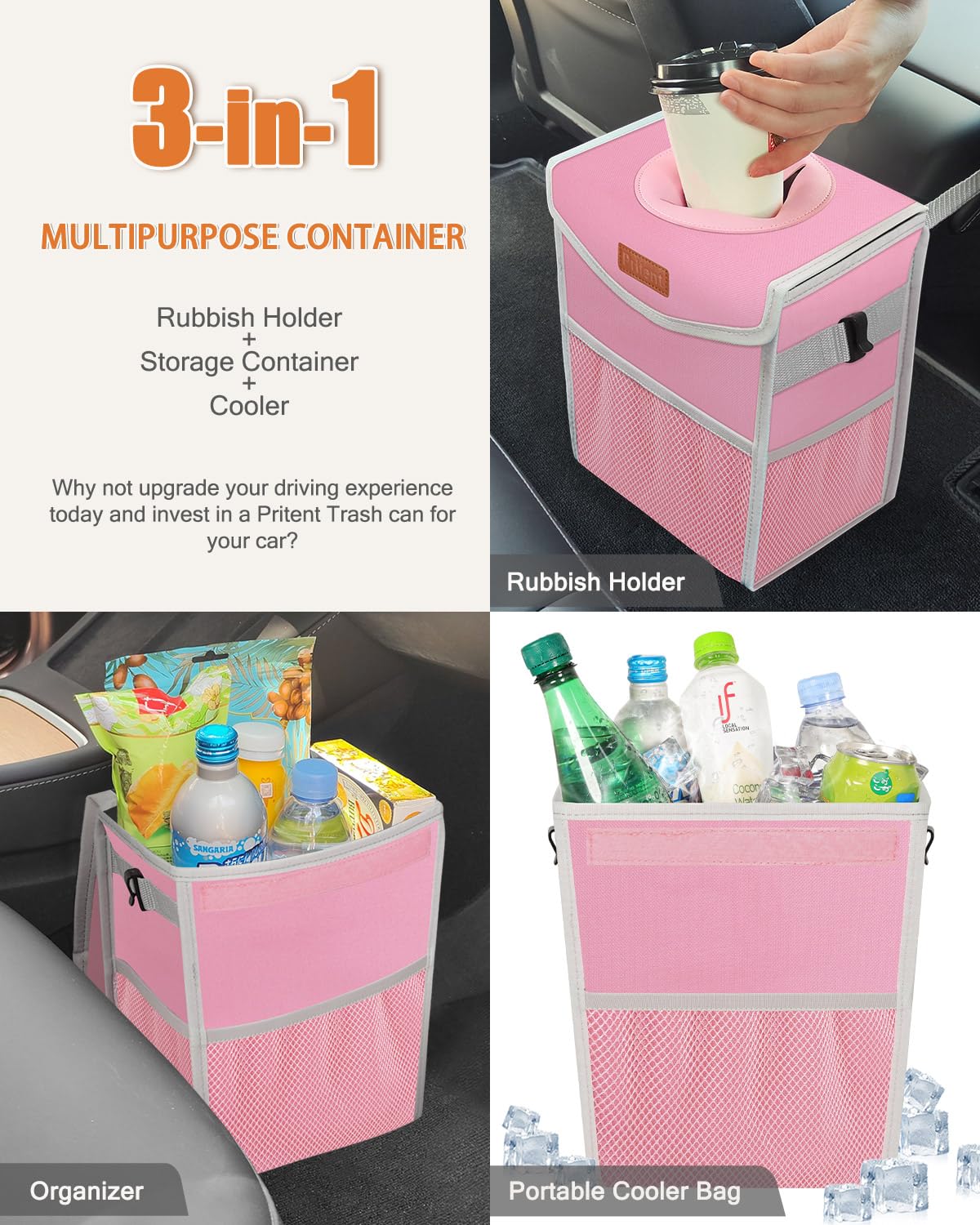 3-in-1 Multipurpose Container With 2.8-gallon Capacity:A game changer for a car neat and organized! It is not only a rubbish holder and car storage organizer, but a nice portable cooler bag for your car. Mesh pockets provide convenient storage places for things like tissues, extra trash bags, and cleaning wipes. The mesh pockets can hold anything you want to keep within arm’s reach in your car. Why not upgrade your driving experience today and invest in a Pritent Trash can for your car?