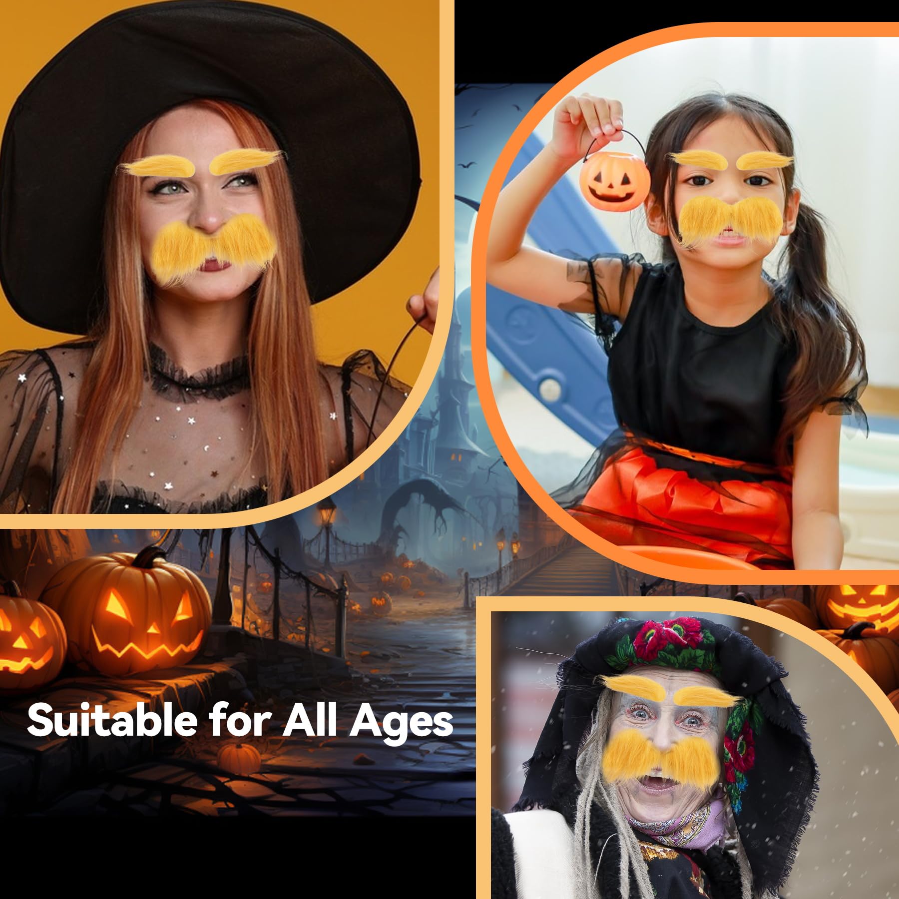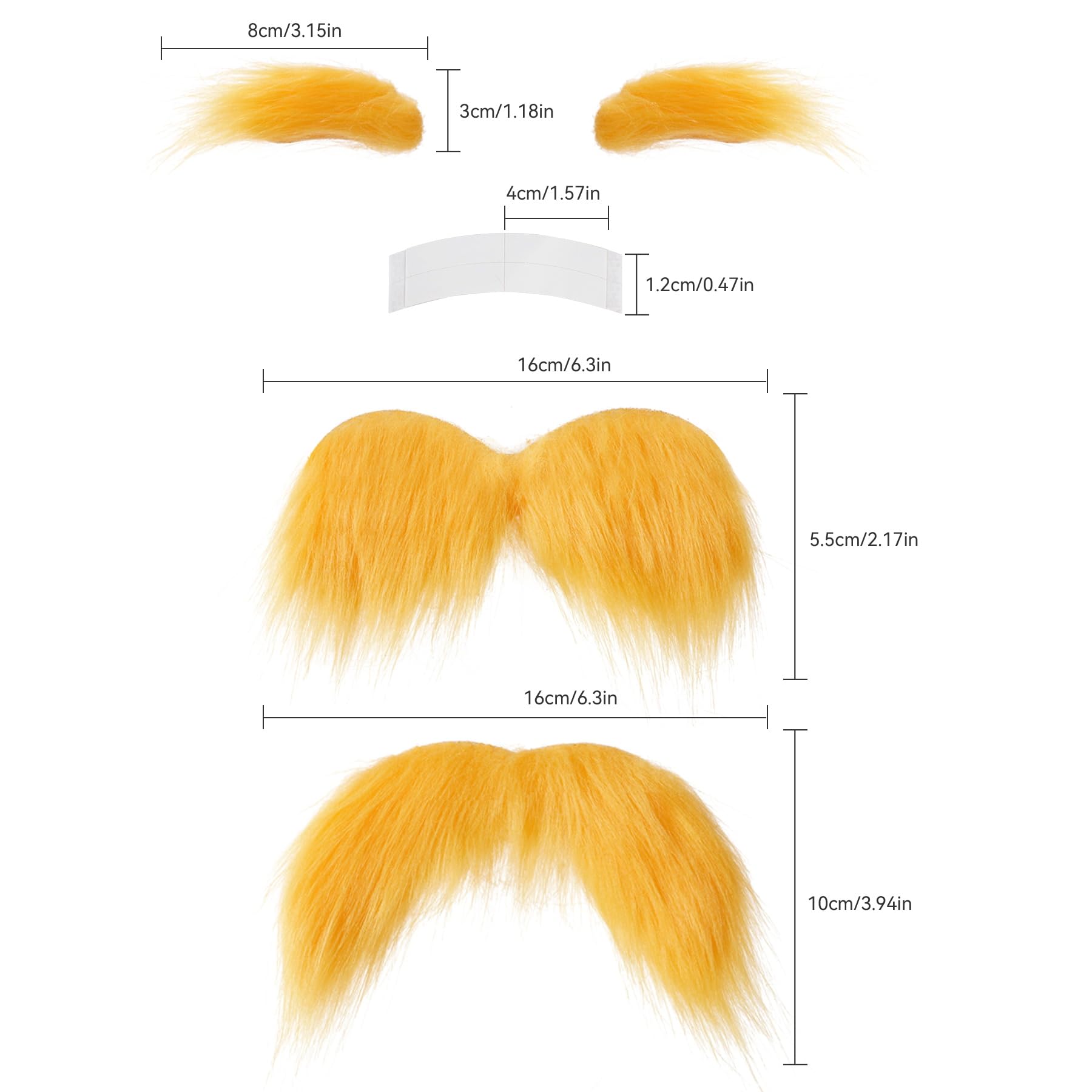 【Product Dimensions & Easy to Use】The big yellow fake handlebar mustache measures about 6.3"x3.94", the small blonde mustache measures about 6.3"x2.17", the eyebrow measures about 3.15"x1.18", the spare size of a small piece of tape measures about 1.57"x0.47". The self-adhesive backing makes it easy to stick and remove, convenient to use, simple and fast, easily fits the face, simplifies your dressing process, and is the perfect clothing accessory.