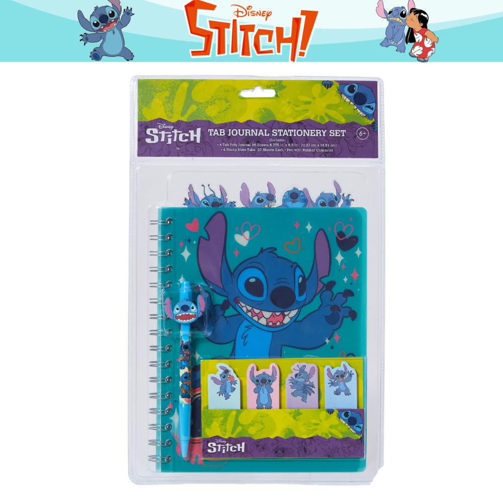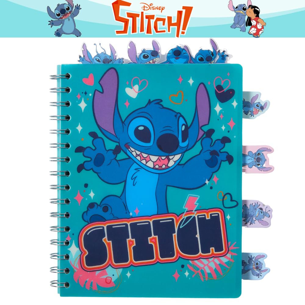 SPIRAL NOTEBOOK SET β this cute stationery set features a (8 x 7) notebook with Stitch on the front cover, lined pages with color images of Stitch on the corners, 4 color illustrated section dividers, tab dividers, 80 sticky note tabs, and a matching stitch click pen with a rubber character!
