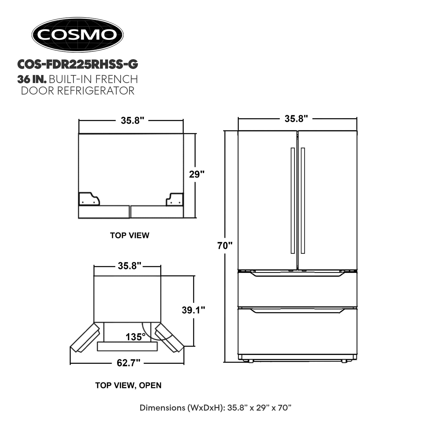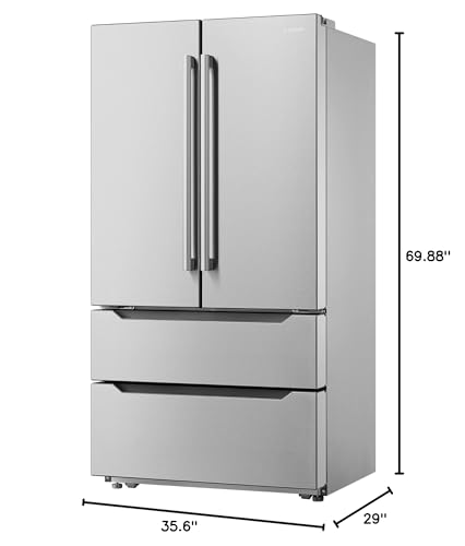 FEATURES AND DIMENSIONS – Automated ice-maker, clear LED interior lighting, digital controls, extendable freezer drawers, external digital temperature control, and display, soft-close mechanism of the refrigerator and freezer doors, door alarm, Energy Star Rating, 115V/60Hz and 35.8” x 29” x 69.9” (WxDxH)